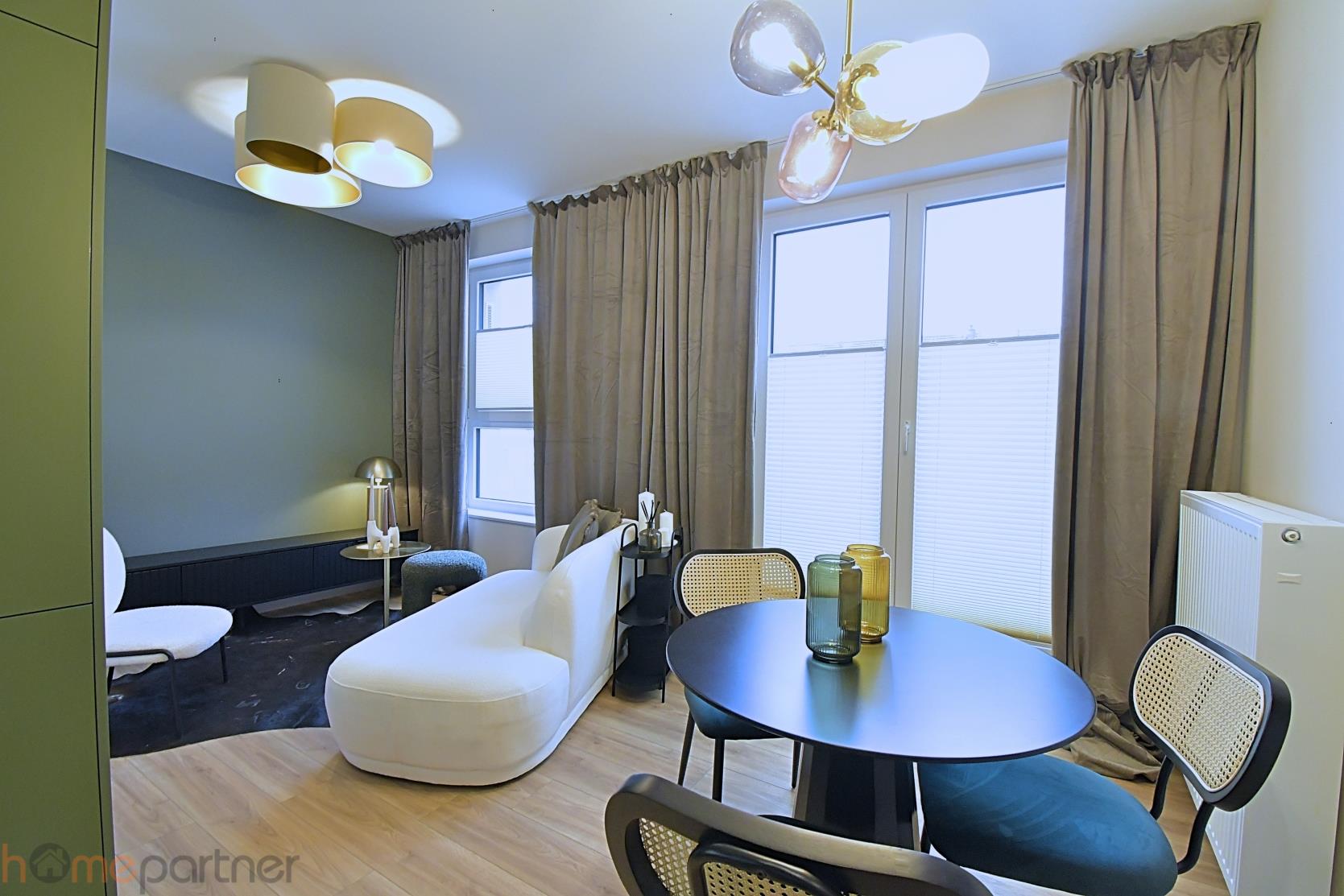 Mieszkanie jest umeblowane i wykończone materiałami wysokiej klasy. We wszystkich oknach rolety plisowane wewnętrzne oraz zasłony.