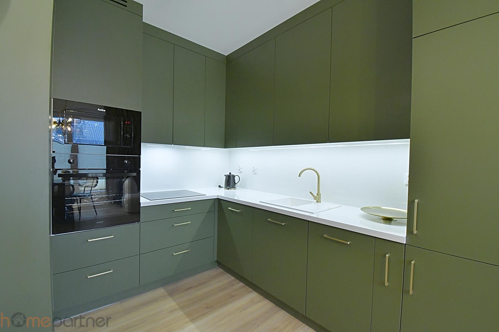 Kuchnia w zabudowie wyposażona w lodówko-zamrażarkę, płytę indukcyjną, piekarnik, mikrofalę, okap, zmywarkę 45 cm.