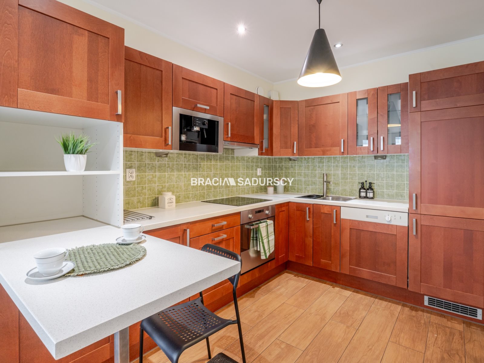 Mieszkanie wykończone dobrymi materiałami: na podłodze deska drewniana (gdzieniegdzie do odświeżenia), okna drewniane, kuchnia wykończona meblami z IKEA na wymiar wraz z niezbędnym AGD w zabudowie (zmywarka 60 cm, piekarnik z grillem, płyta indukcyjna, lodówko- zamrażalka, ekspres do kawy). Ogrzewanie oraz ciepła woda miejskie, brak gazu. Od nowości mieszkanie zamieszkane było tylko przez kilka lat dzięki czemu nie jest bardzo zniszczone. Kilka miesięcy temu zostało odmalowane.