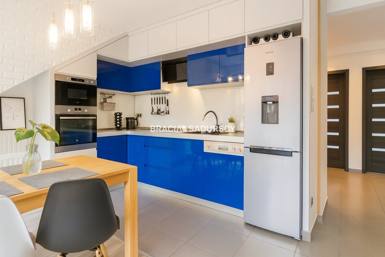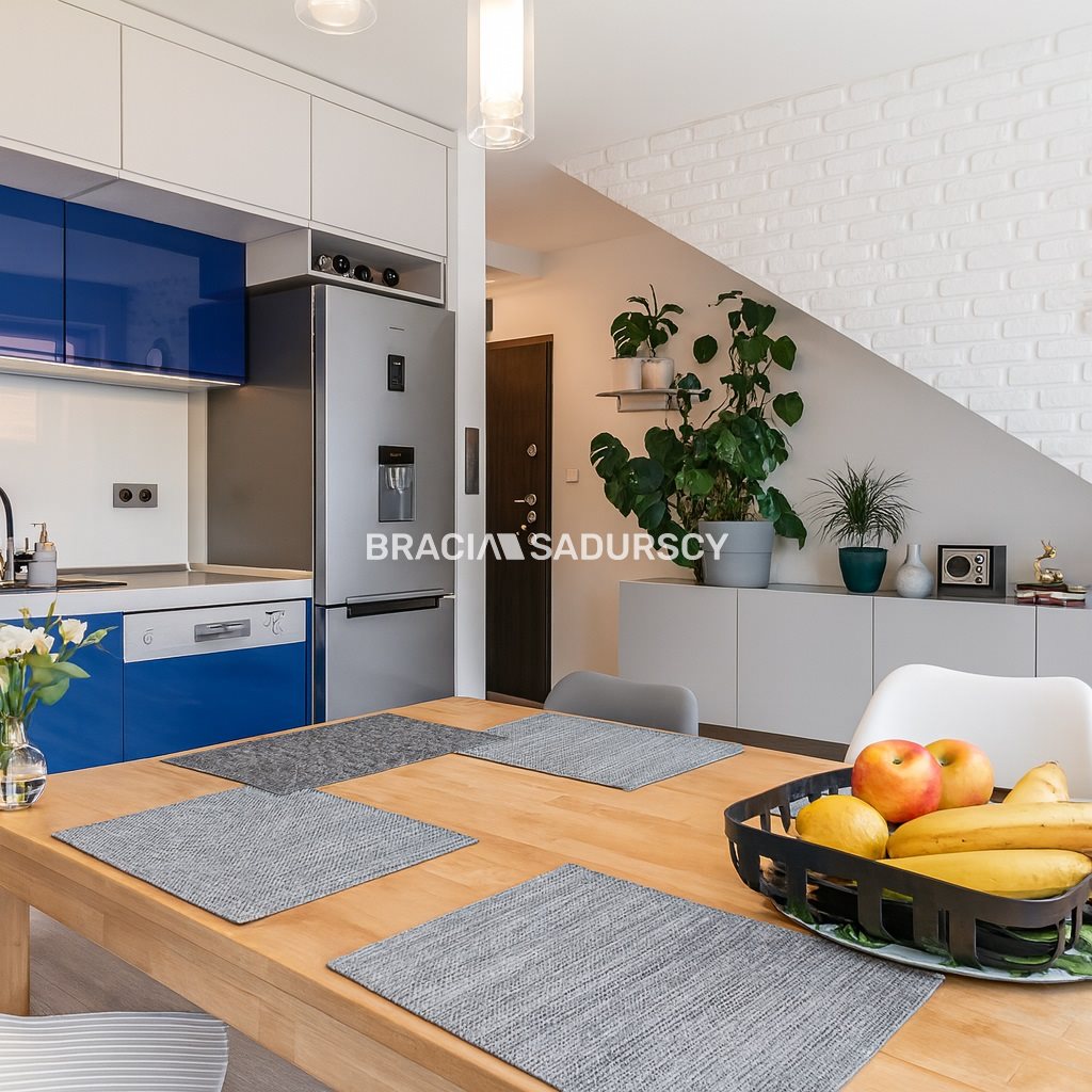 Salonu z aneksem kuchennym o łacznej pow. ok 20 m2 - z salonu wyjście na duży przeszklony balkon - ekspozycja zachodnia. Nowoczesna kuchnia pod zabudowę wyposażona w ciche domyki, system Rejs, cargo oraz sprzęty AGD: płyta AEG, zmywarka Bosch, piekarnik Electrolux z systemem samoczyszczenia, mikrofala Whirlpool, lodówka Samsung. Pomieszczenie posiada podwieszany sufit oraz doskonale zagospodarowane przestrzenie pod skosami oraz meble do sufitu, co zapewnia dużo miejsca do przechowywania. Dodatkowo w maju 2024 zamontowano klimatyzacje, a w oknach zamontowano plisy odbijające światło.