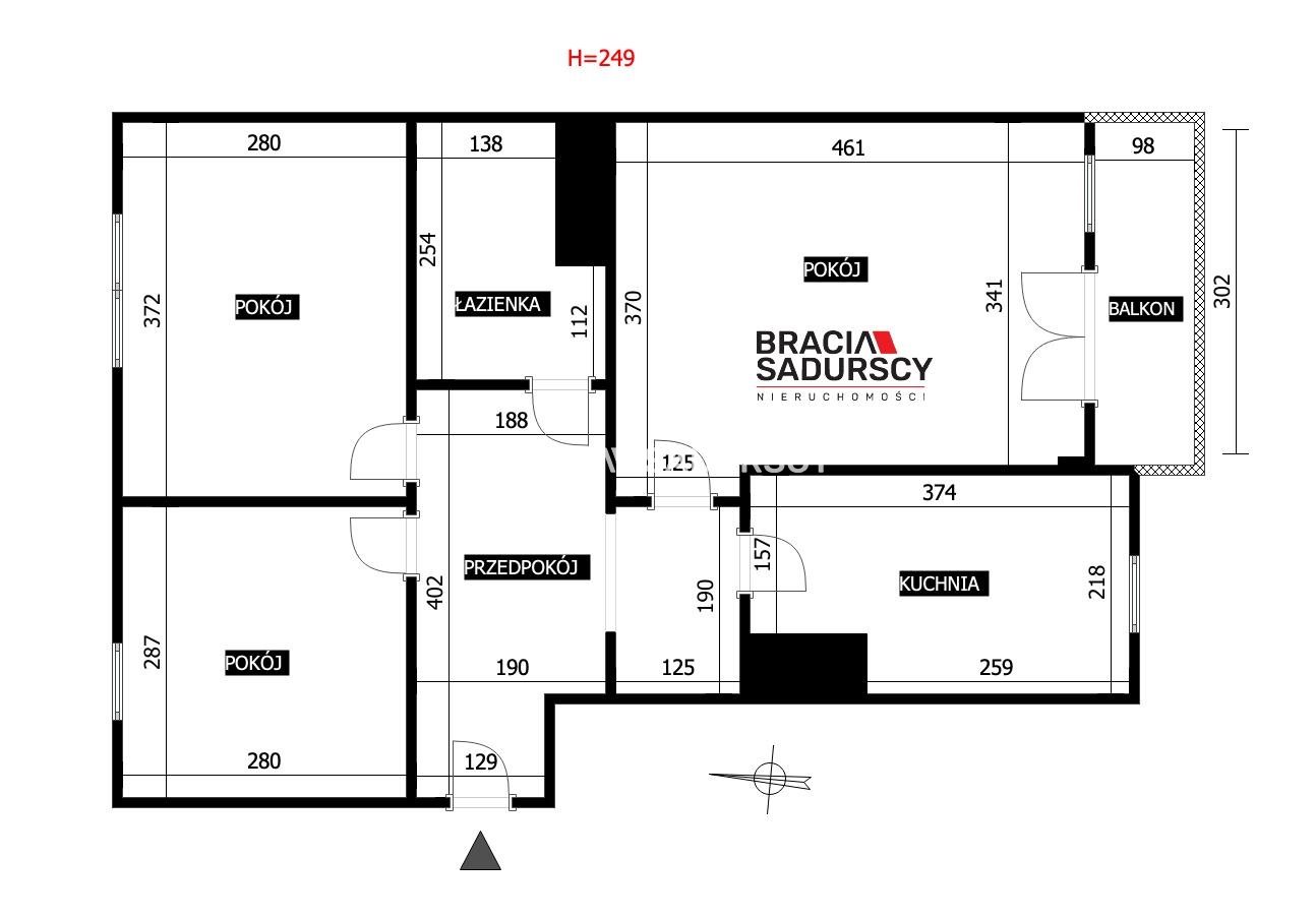 3 pokoje (oddzielne) ok. 57 m2 z balkonem.