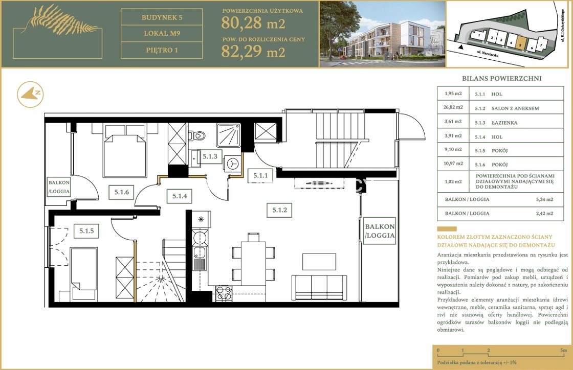 - piętro 1: hol (1,95 m2), salon z aneksem (26,82 m2), 2 pokoje (10,97 m2, 9,10 m2), przedpokój (3,91 m2), łazienka (3,61 m2), 2 balkony (5,34 m2, 2,42 m2)