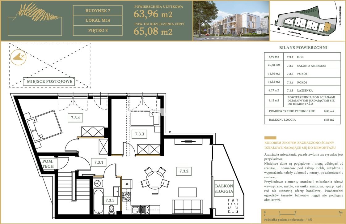 Do mieszkania przynależy (dodatkowo płatne) naziemne miejsce postojowe znajdujące się przy budynku oraz pomieszczenie techniczne (0,89 m2) na kondygnacji mieszkania.