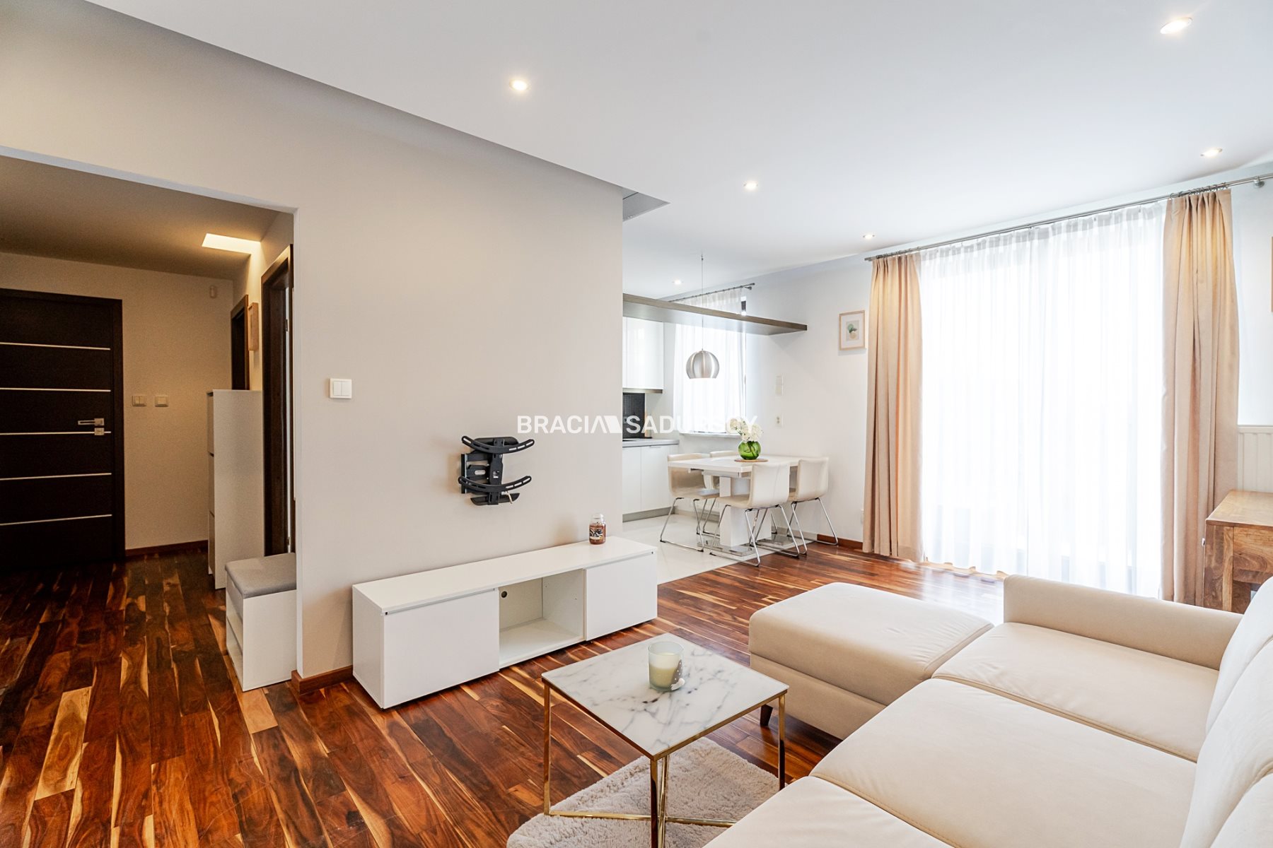 Wnętrze jest urządzone w nowoczesnym, wygodnym stylu - docenisz je szczególnie, jeśli lubisz mieszkania „do życia”, z przemyślanym przechowywaniem i poczuciem przestrzeni oraz estetyki.