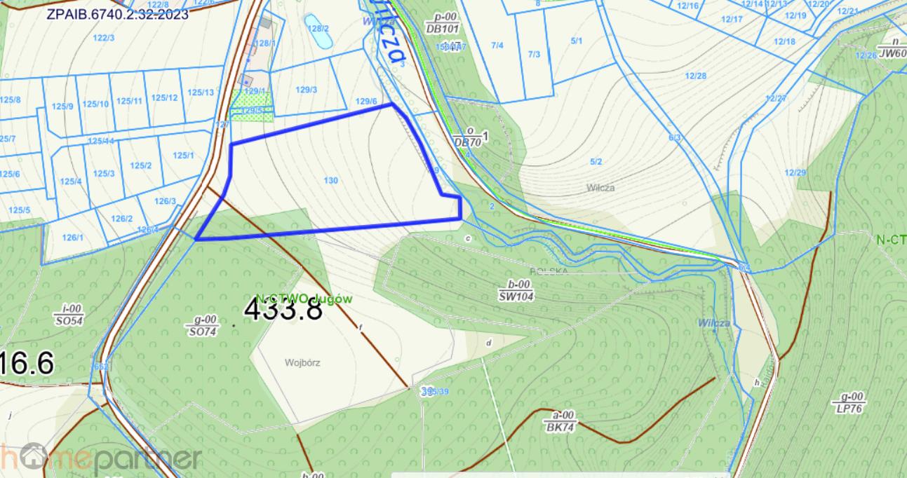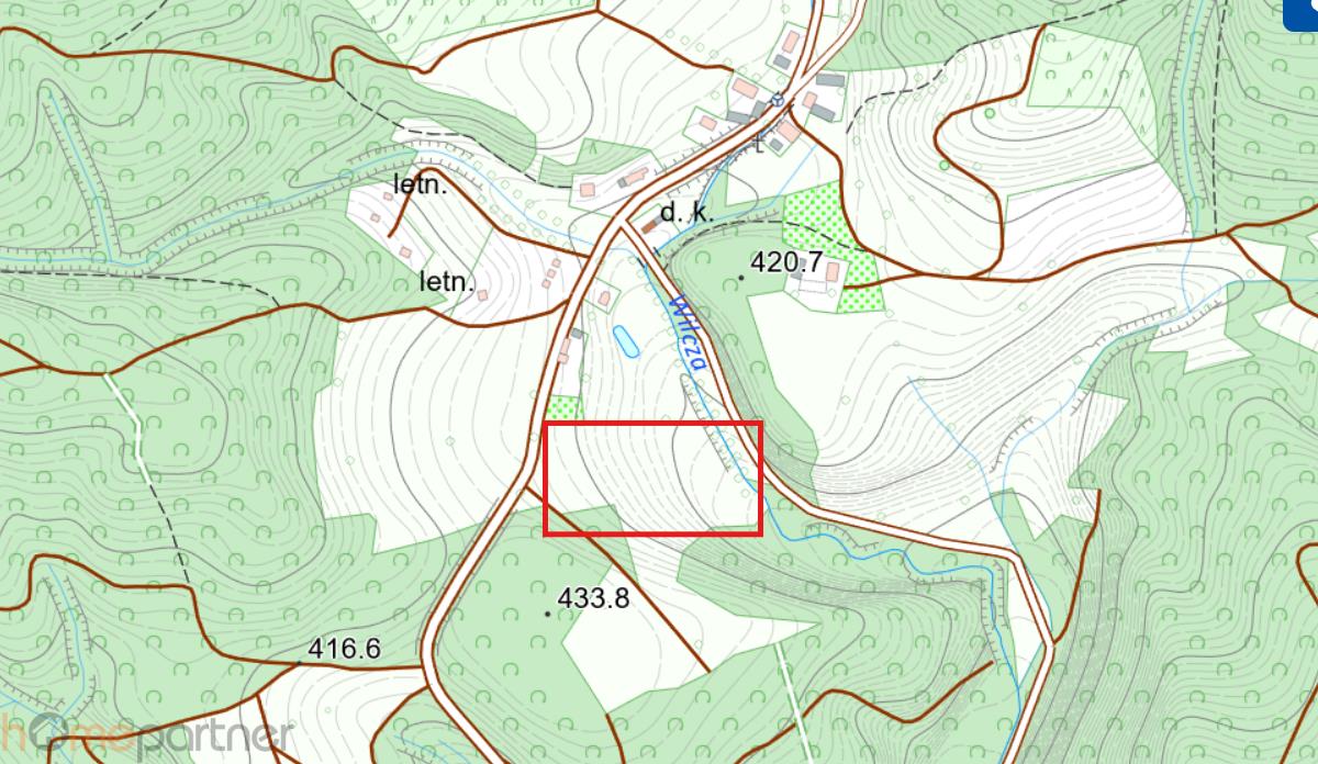 Działka o regularnym prostokątnym kształcie sprzyjającym zabudowie lub ewentualnemu podziałowi. Ukształtowanie terenu jest lekko nachylone, widokowe. Jeden bok działki przylega do strumienia. Istnieje możliwość przeniesienia pozwolenie na budowę stawu. W otoczeniu: natura, brak uciążliwej zabudowy. Stan prawny: uregulowany. Działka posiada dostęp do podstawowych mediów, co znacząco ułatwia i przyspiesza proces inwestycyjny (energia elektryczna oraz wodociąg gminny w drodze).