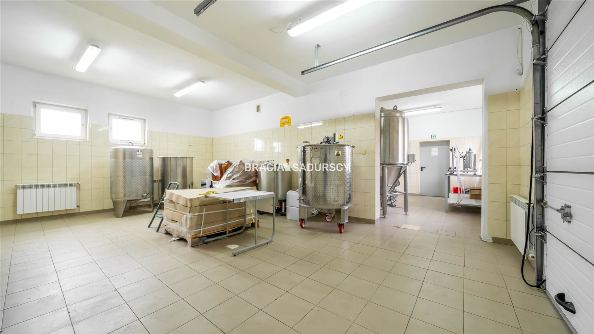 - na parterze - wysokim na ponad 3 metry, są dwa pomieszczenia do produkcji - 37m2 i 35m2, do tego dwa pomieszczenia magazynowe i schowek, a także kotłownia - z piecem dwufunkcyjnym, zasobnikiem wody i centralką odsługującą fotowoltaikę.
