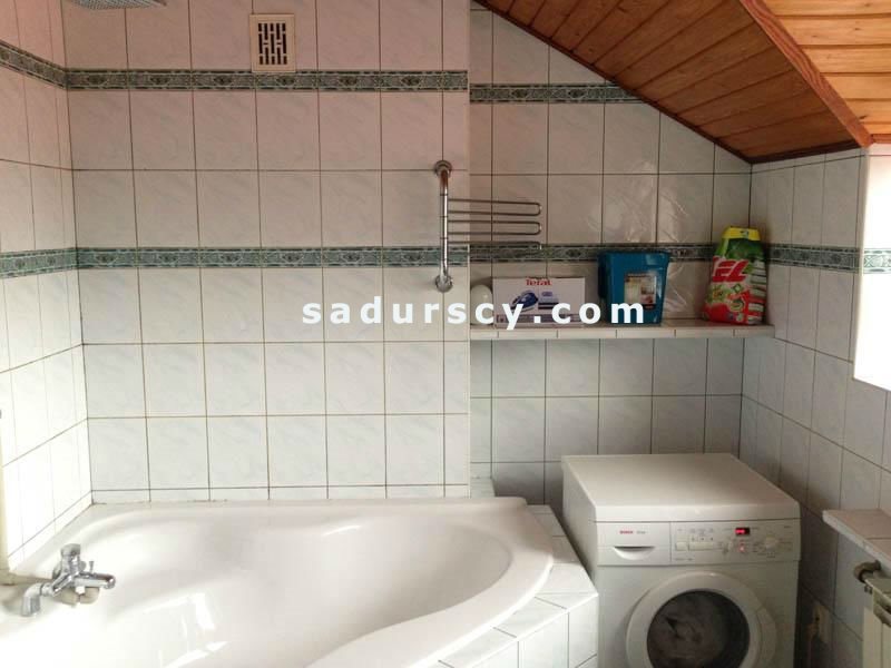Na parterze salon 45m 2 z kominkiem, wyjściem na taras 75m 2 od południowego zachodu. Okna w salonie od południowego zachodu, południowego wschodu, północnego zachodu. Jadalnia z oknami od północnego zachodu, kuchnia z oknem od północnego wschodu. W kuchni zabudowa i sprzęt AGD: płyta ceramiczna, piekarnik elektryczny, okap, zlewozmywak, lodówka. Z holu dostępne toaleta z WC, umywalką i prysznic. W parterowym skrzydle budynku sześć sypialni, po ok. 12m 2 każda, oraz łazienka z wanną owalną. Na półpiętrze dwa pokoje: 40m 2 i 15m 2 z tarasem 12m 2 . Na piętrze dwie sypialnie: 40m 2 i 35m 2 . Skosy. Na podłodze klepka dębowa. Toaleta z WC umywalką, łazienka z kabiną prysznicową.