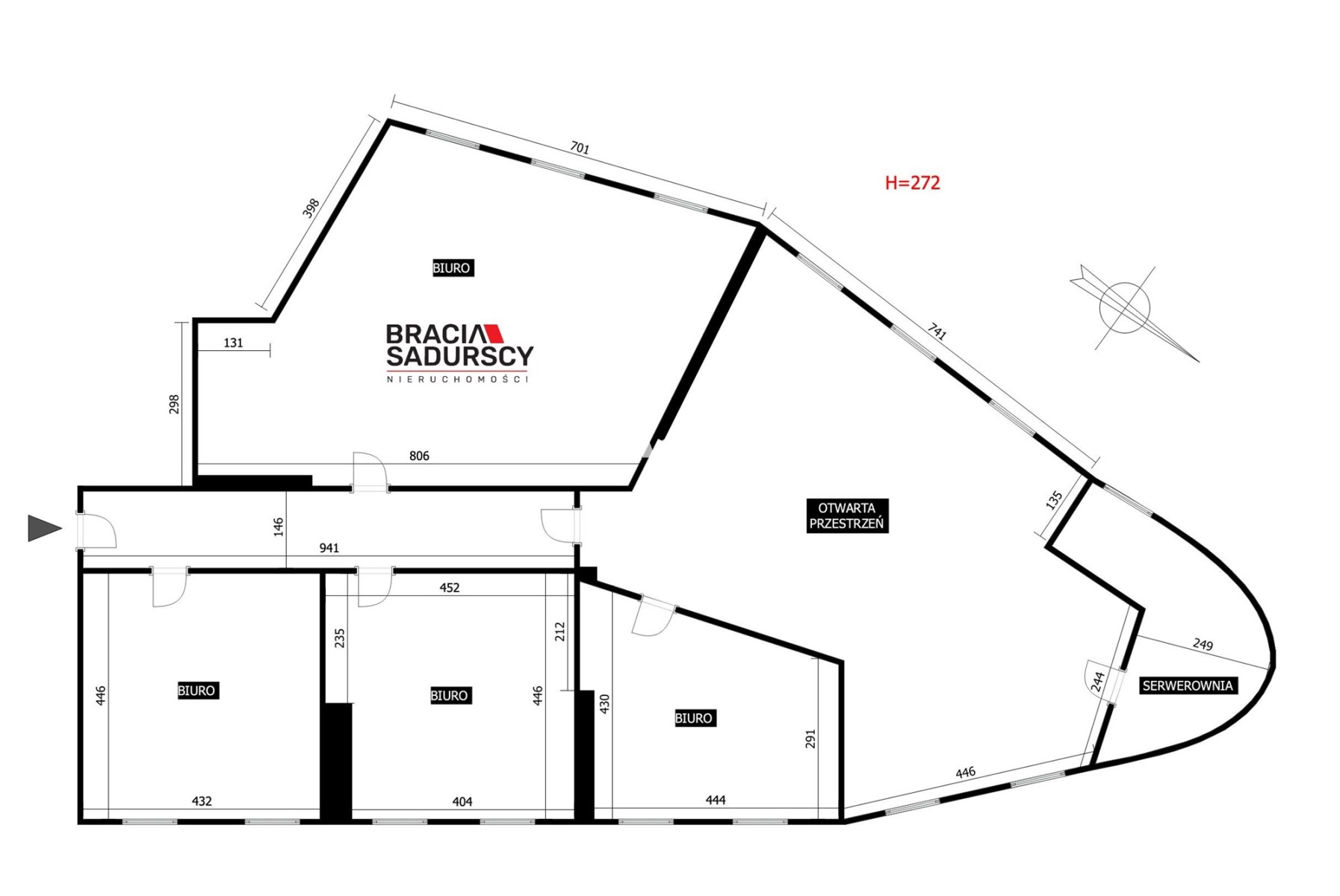 Układ: kilka wydzielonych pokoi biurowych, serwerownia, korytarz (oznaczone na rzucie jako BIURO 5-8)