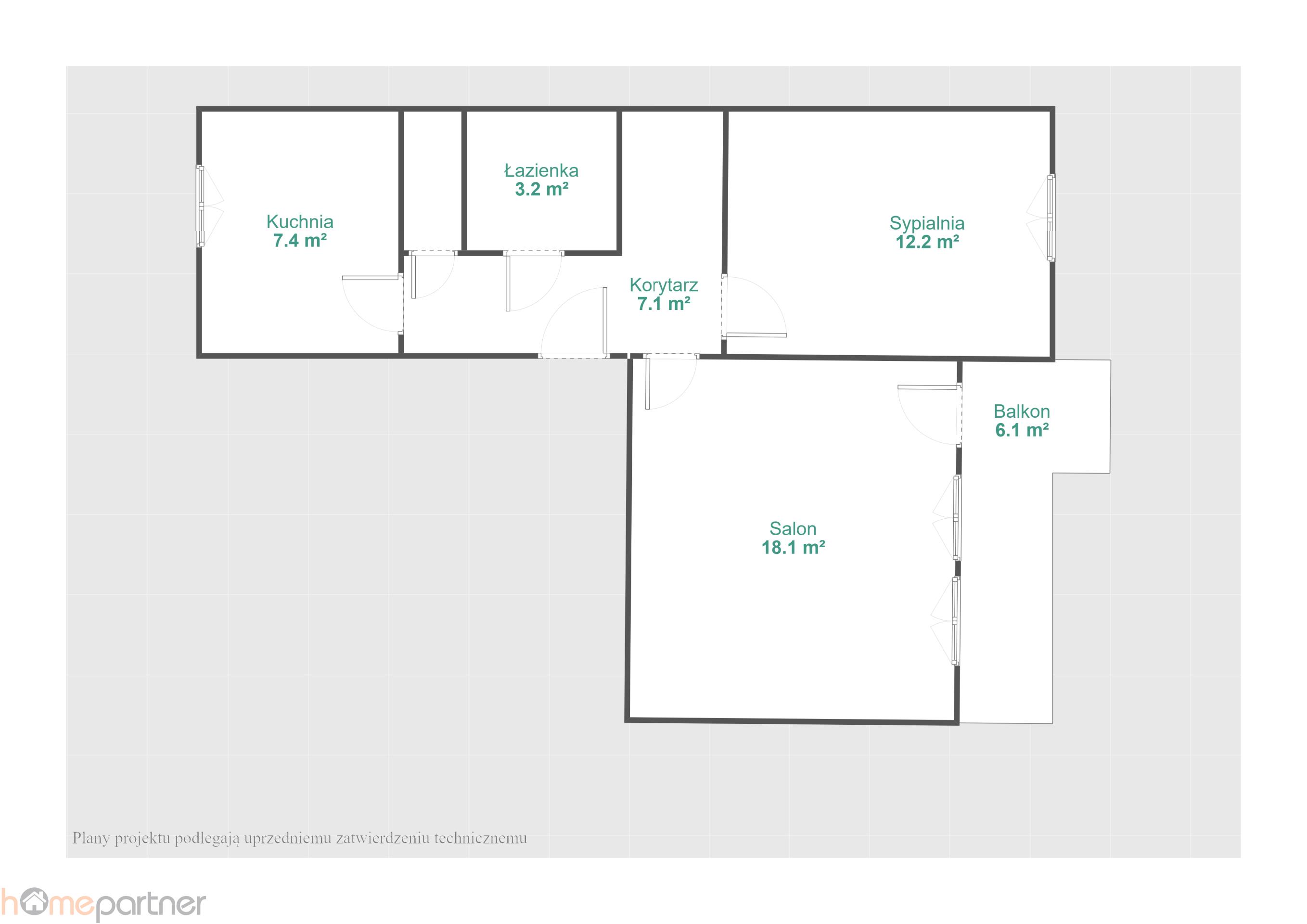Układ pomieszczeń, pozwalający na komfortowe mieszkanie dla pary lub znajomych.