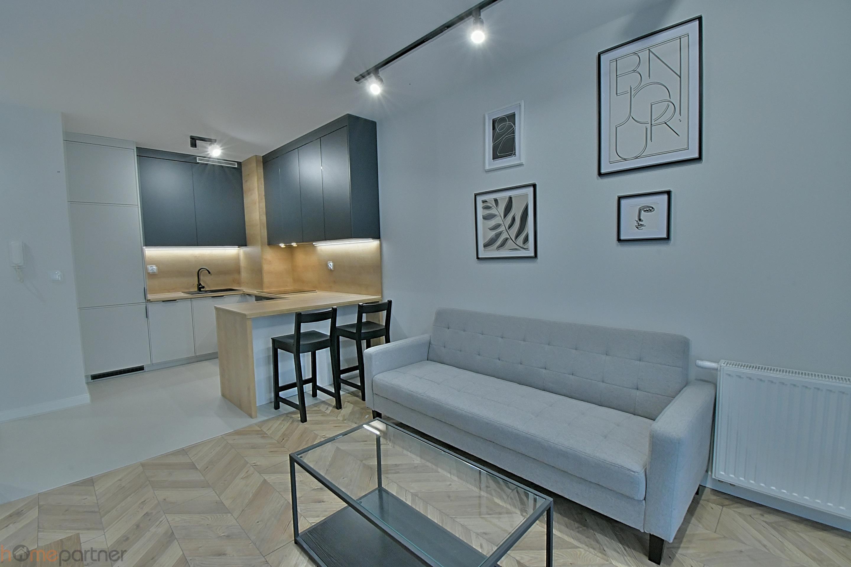 Mieszkanie jest umeblowane i nowocześnie zaaranżowane, wykończone materiałami wysokiej klasy. Kuchnia w zabudowie wyposażona w lodówko-zamrażarkę, płytę indukcyjną, piekarnik, okap, zmywarkę. Łazienka z wanną, pralka na wyposażeniu. W sypialni łóżko małżeńskie i duża szafa w zabudowie. Salon kompletnie wyposażony: sofa rozkładana z pojemnikiem na pościel, ława, meblościanka. Wszystkie sprzęty i wyposażenie w bardzo dobrym stanie.
