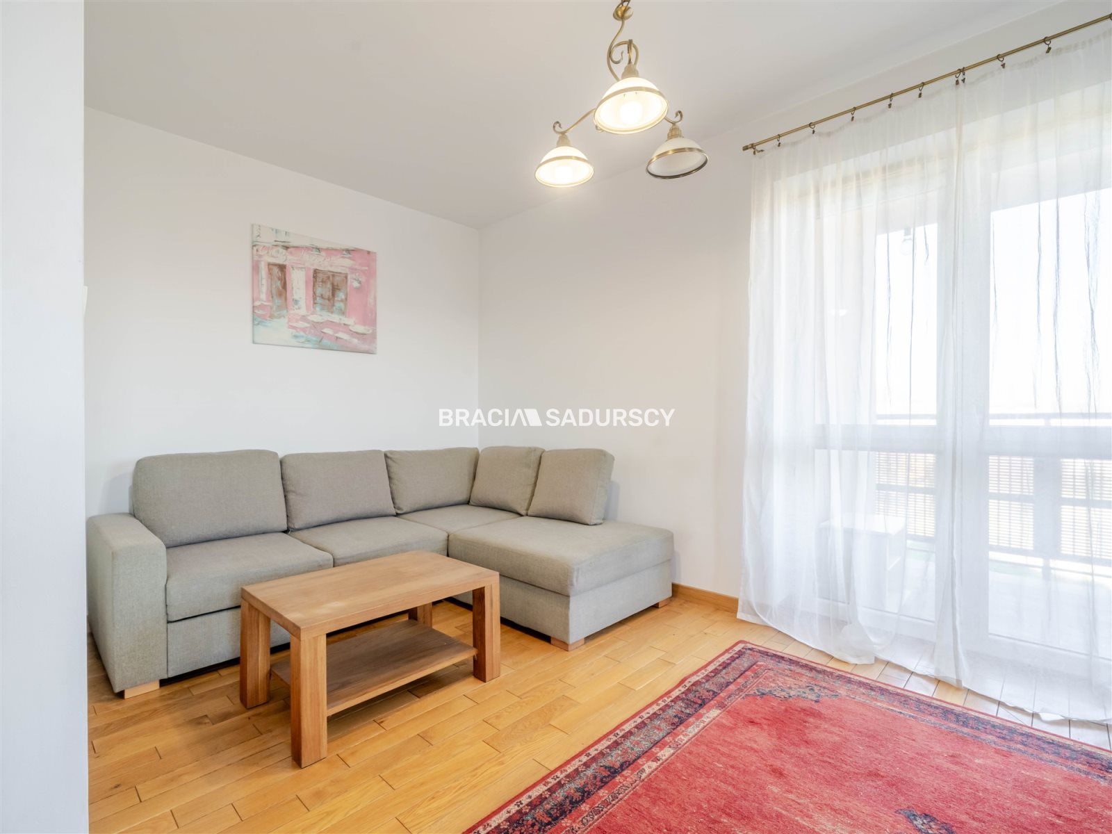 przestronnego salonu z aneksem kuchennym i wyjściem na balkon,
