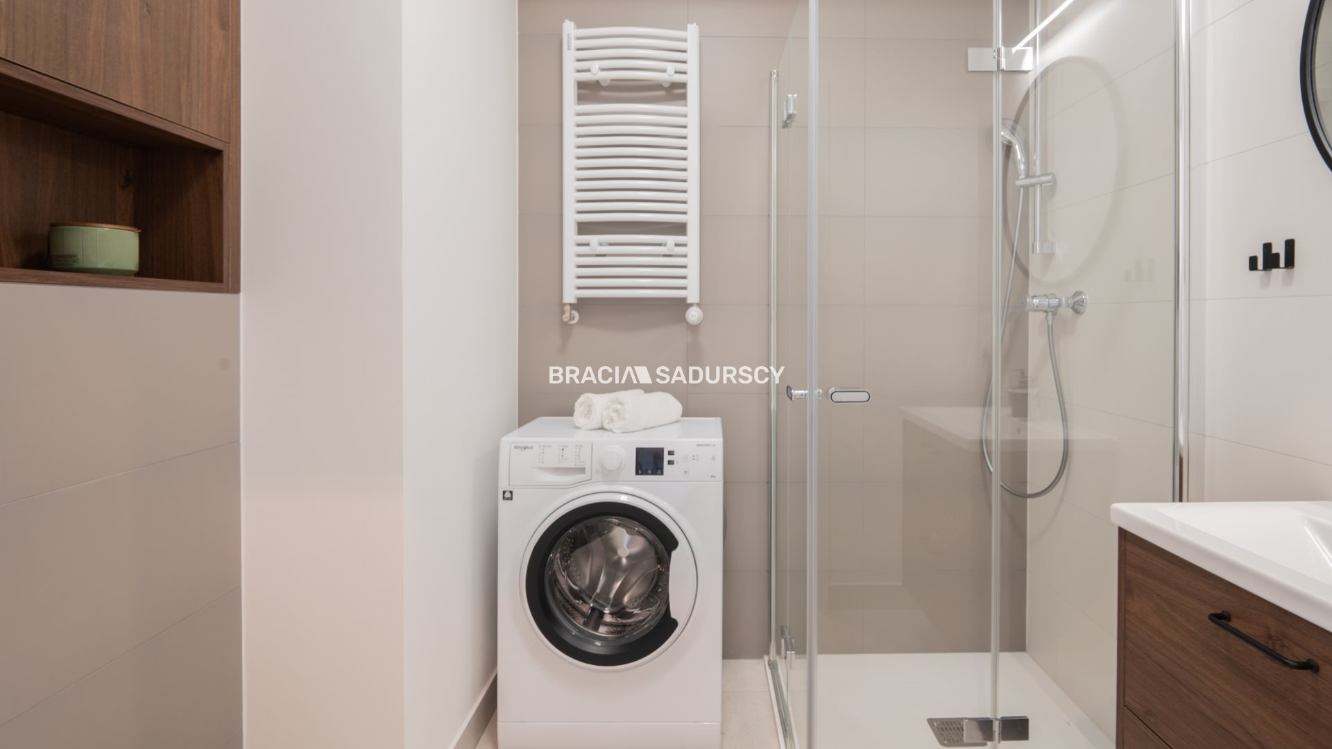 Łazienka : kabina prysznicowa, pralka, szafki na kosmetyki i środki czystości.