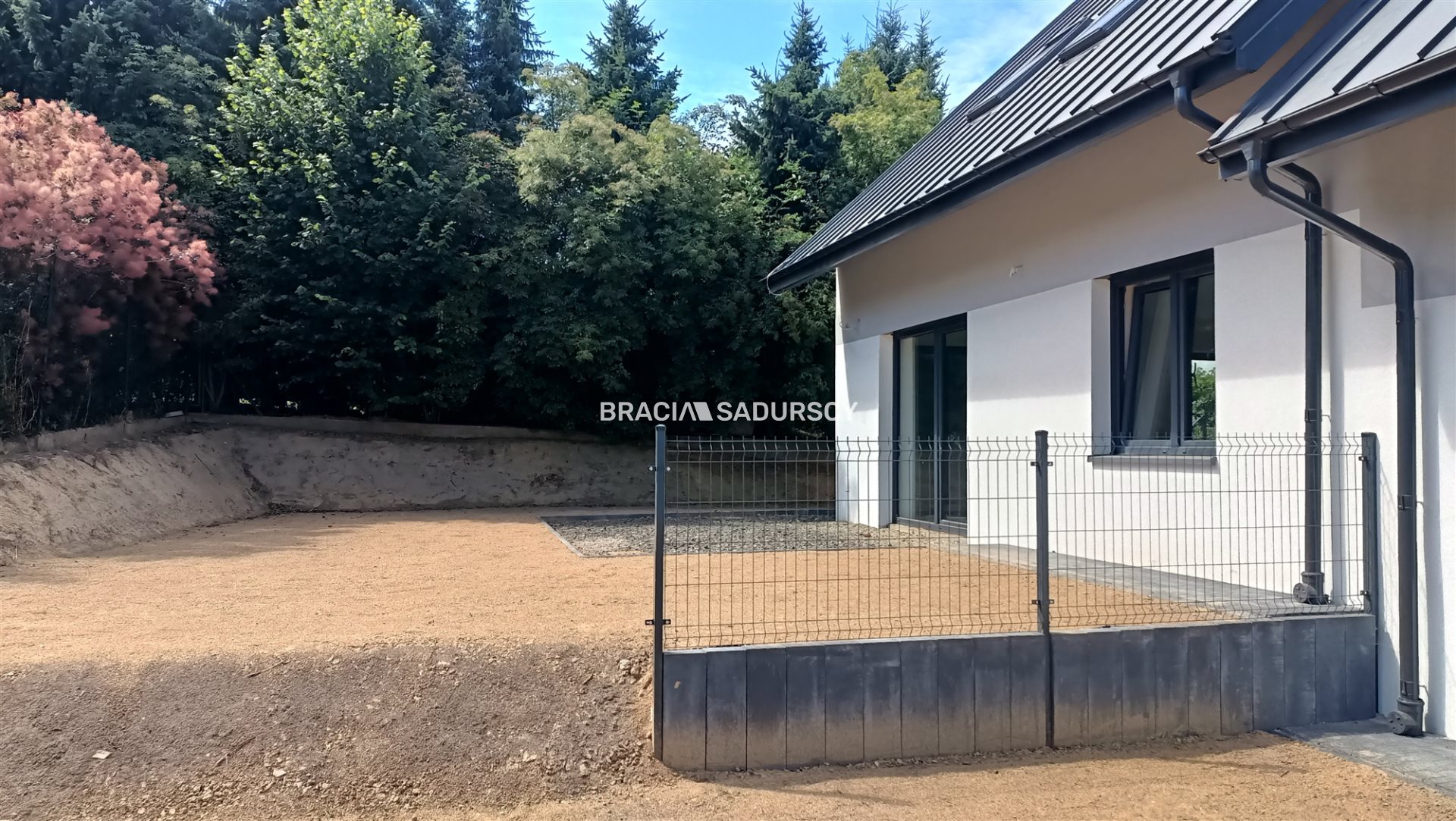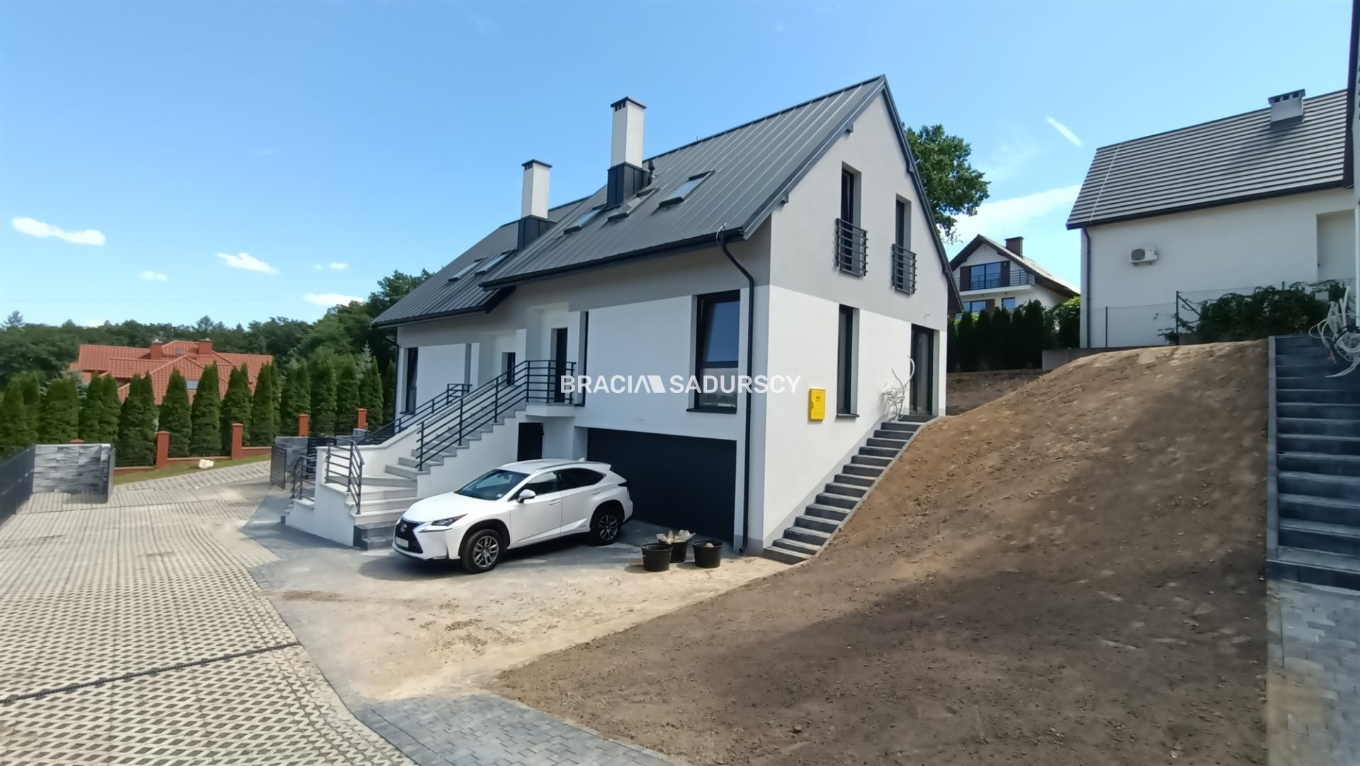 Każda połowa domu ma działkę około 300m2. Z przodu podjazd a z tyłu ogródek z tarasem.