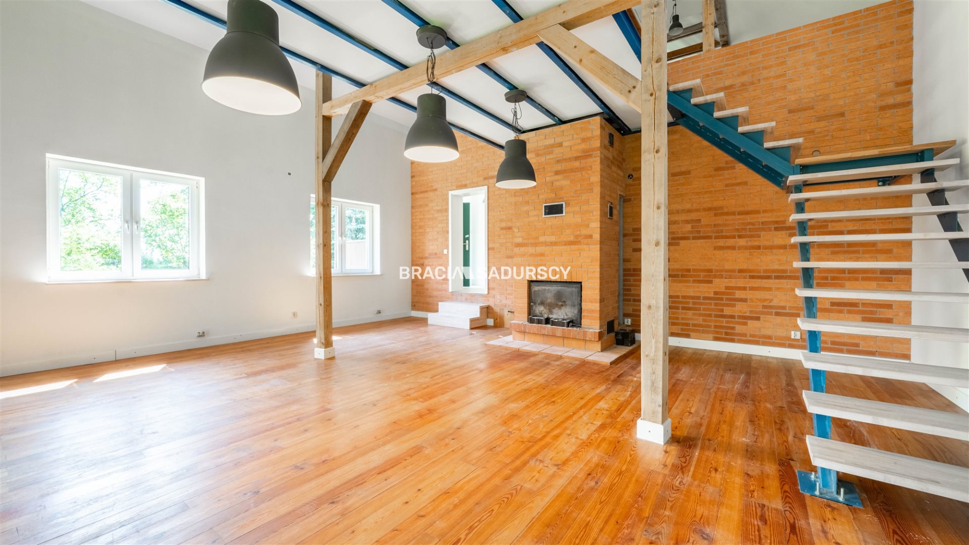 Wnętrza łączą styl loftowy z elementami tradycji - drewniana podłoga z modrzewia, ceglane akcenty przy kominku i przemyślany układ pomieszczeń dają wyjątkowy efekt przytulności i przestrzeni.