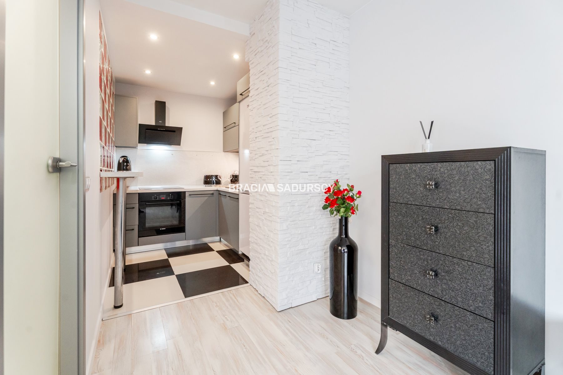 Wnętrza zostały odświeżone i utrzymane w eleganckiej stylistyce, z jasnoszarymi ścianami oraz starannym wykończeniem.