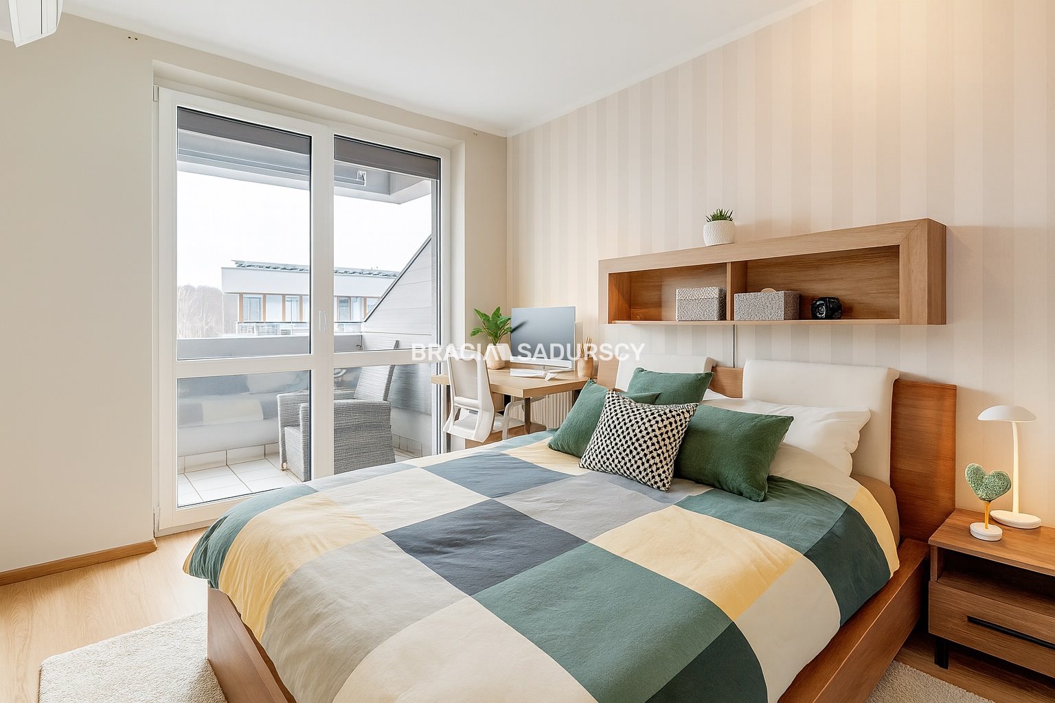 Przytulna sypialnia z dźwiękoszczelnym oknem i wyjściem na balkon