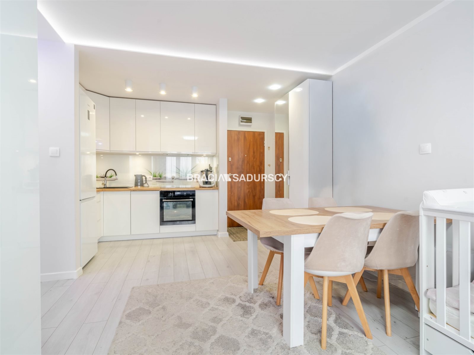 - kuchnia wykonana na wymiar (meble lakierowane), w pełni wyposażona w sprzęt AGD: lodówka, zmywarka, piekarnik, płyta indukcyjna, mikrofala, pochłaniacz