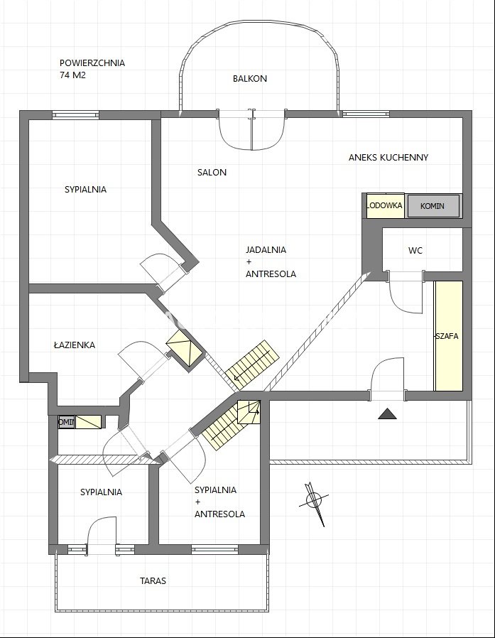 Powierzchnia mieszkania została maksymalnie zagospodarowana z dbałością o funkcjonalność i ergonomię układu. Rozkład obejmuje salon z aneksem kuchennym, 3 niezależne sypialnie na poziomie podstawowym oraz 2 dodatkowe sypialnie na antresolach, łazienkę, osobne WC, balkon oraz taras. Mieszkanie jest dwustronne i dobrze doświetlone.