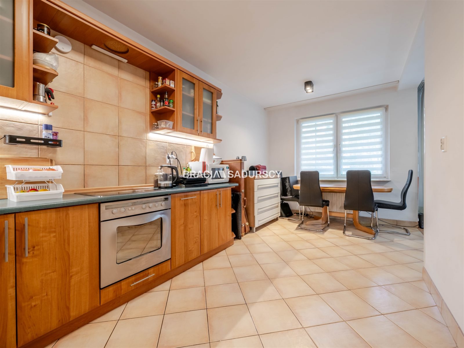 - Duża (pow. ok. 15 m2), w pełni wyposażona kuchnia z meblami wykonanymi na wymiar oraz sprzętem AGD: płytą ceramiczną z piekarnikiem, zmywarką 60 cm, lodówką z zamrażarką w zabudowie. W części jadalnej stół z krzesłami.