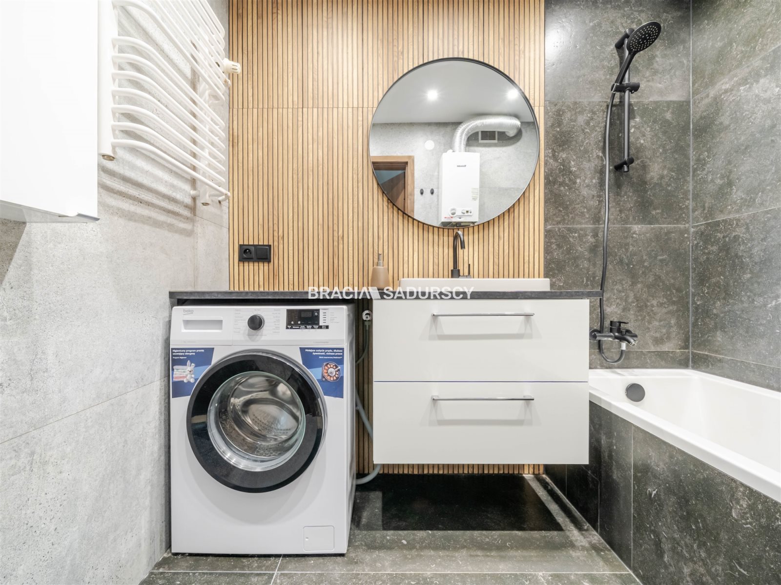 Kuchnia została wykonana na wymiar i wyposażona w piekarnik, płytę elektryczną, zmywarkę, okap oraz nowoczesną lodówkę. Łazienka posiada wannę, pralkę i miejsce do przechowywania. Sypialnie wyposażone są w łóżka, szafę w zabudowie, komody oraz biurko.