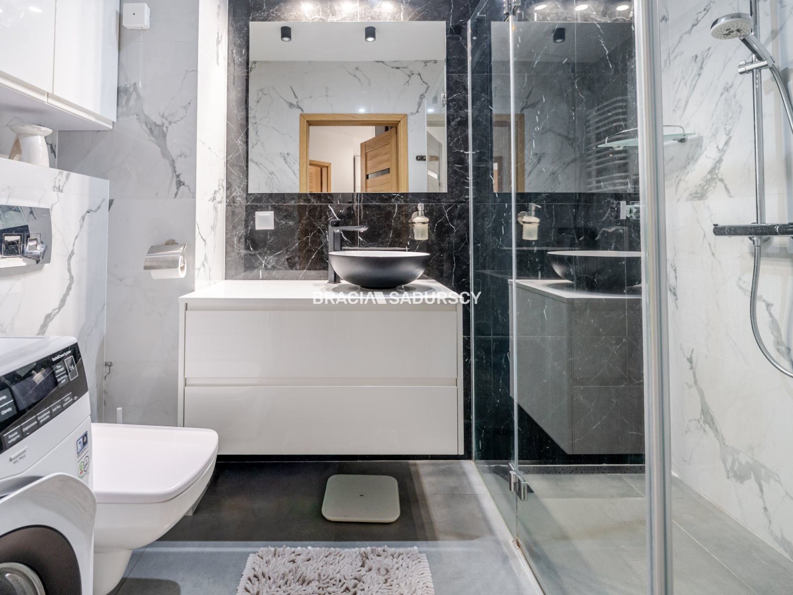 E legancka łazienka w bieli i czerni . Kontrastowe połączenie czarnych akcentów z białymi powierzchniami tworzy nowoczesny, luksusowy charakter. Dobrej jakości armatura, duże lustro, zabudowa meblowa oraz wygodna kabina prysznicowa nadają wnętrzu hotelowy standard.