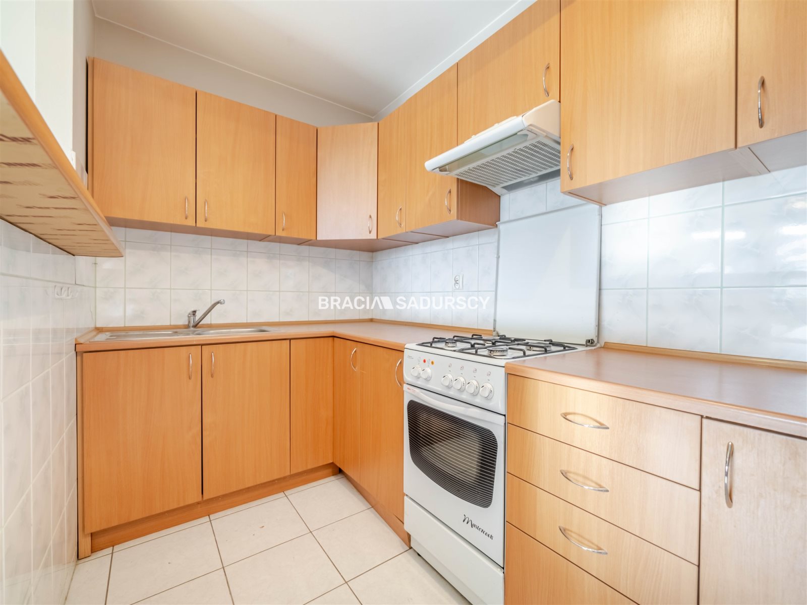 W kuchni znajdują się meble wraz ze sprzętem AGD. Na podłogach panele oraz płytki.
