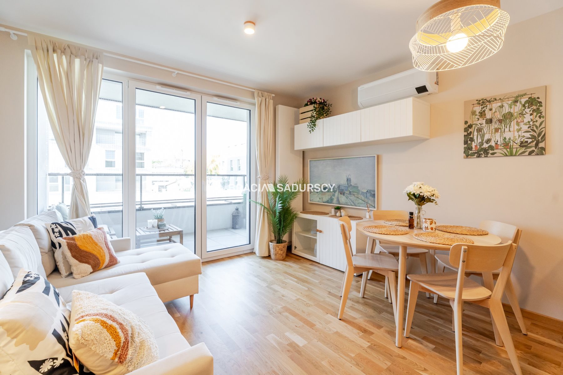 - przestronny salon z aneksem kuchennym - w pełni wyposażany także w sprzęty typu lodówka, zmywarka, piekarnik, płyta indukcyjna, telewizor The Frame, wygodny narożnik, jednostkę klimatyzacji i meble