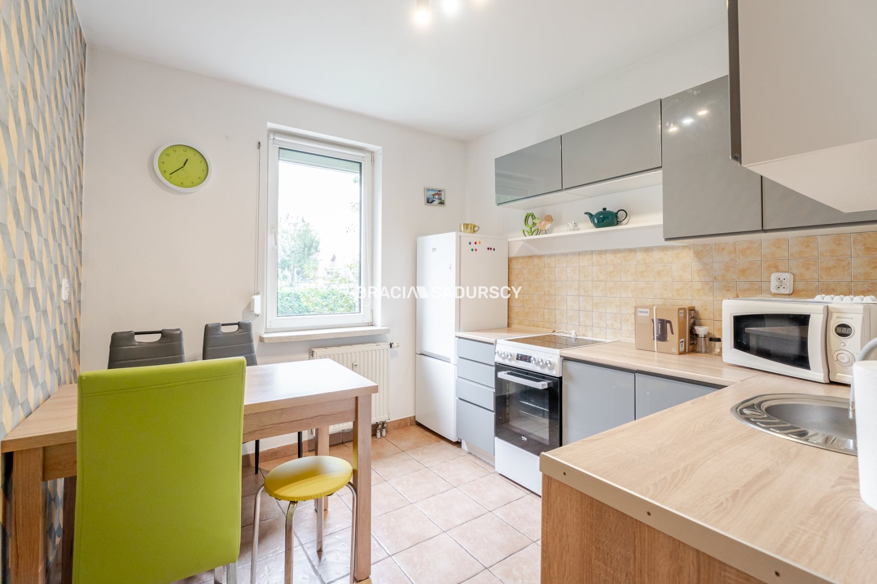 jasnej, przestronnej kuchni z oknem i miejscem do spożywania posiłków,