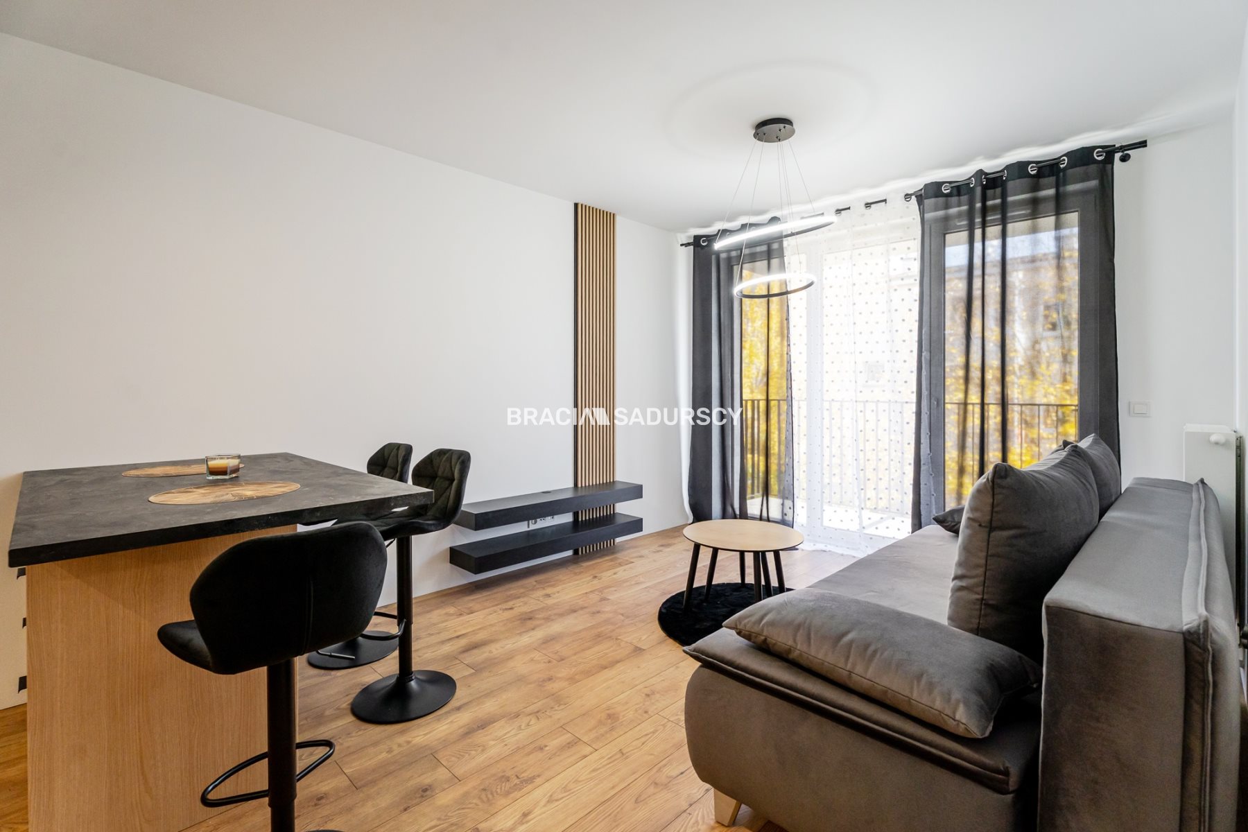 Przestronny salon z aneksem kuchennym i wyjściem na duży balkon