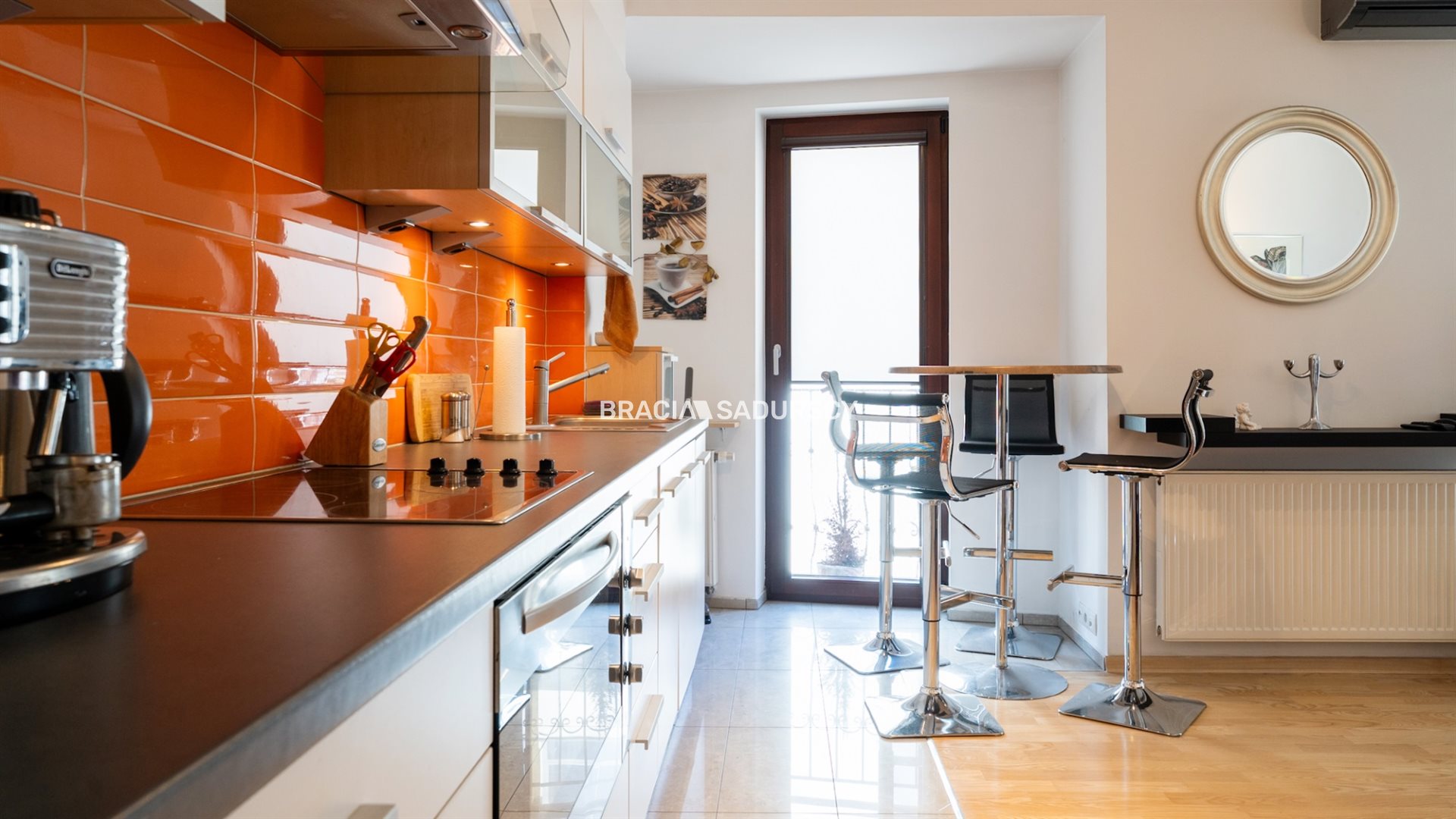 Aneks kuchenny został wyposażony w: zmywarkę, lodówkę, płytę grzewczą, piekarnik, mikrofalę, okap oraz mały ekspres do kawy. W salonie znajduje się wygodny narożnik, fotel, telewizor oraz klimatyzacja. Mieszkanie wykończone w dobrym standardzie, gotowe do zamieszkania.