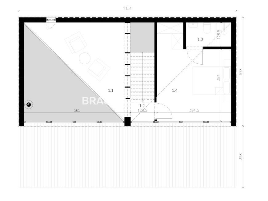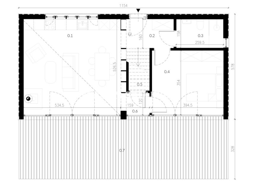 Posadowiony jest na 9-ciu betonowych kolumnach fundamentowych. W środku to 35 m2 powierzchni użytkowej w której pod jednym dachem udało się zaprojektować; salon, kuchnie jadalnie, łazienkę i sypialnie na antresoli z widokiem. Cały dom został wykonany w technologii drewnianej z wewnętrznym ociepleniem, co sprawia, że dom można użytkować przez cały rok.