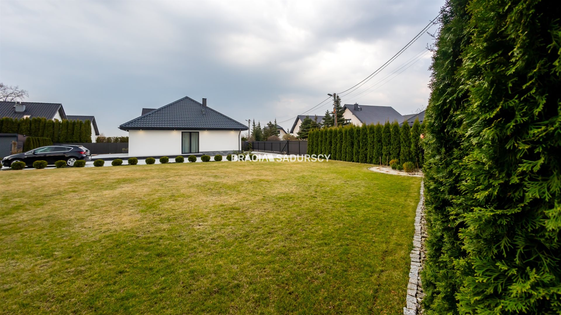 W pełni zaprojektowany ogród który zdobią świerki, sosny, cisy oraz trawy ozdobne, panele z bluszczu, hortensje.