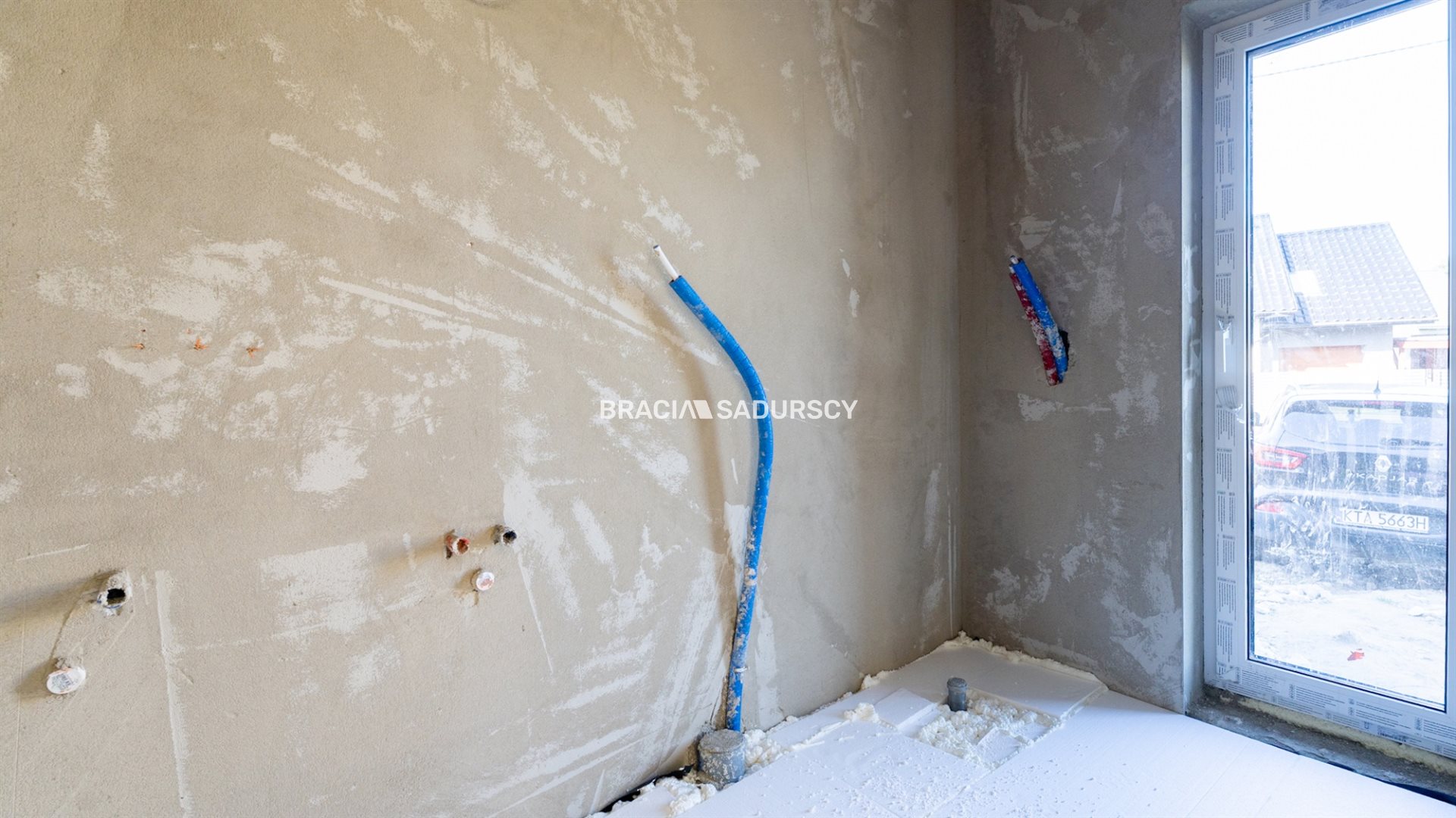 Dom w stanie developerskim, 1 piętrowy, w/g projektu "Dom w Kurkumie 3", Ściany zewnętrzne z betonu komórkowego 24 cm, ocieplone styropianem (20 cm). Dach kryty dachówką ceramiczną, ocieplony wełną mineralną (25 cm). Okna PCV - 3 szybowe, ogrzewanie i ciepła woda z pompy ciepła. Ogrzewanie podłogowe. Kanalizacja miejska, woda z sieci. Dodatkowo klimatyzacja.
