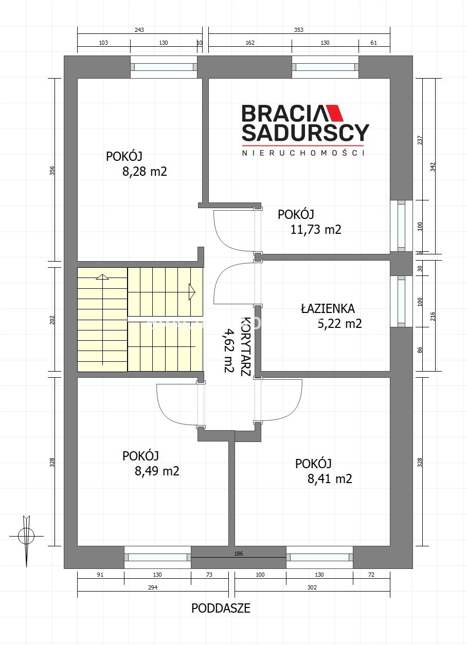 Na poziomie piętra znajduje się przedpokój, łazienka (5,22 m 2 ) oraz 4 pokoje o pow.: 11,73 m 2 ; 8,49 m 2 ; 8,41 m 2 i 8,28 m 2 .