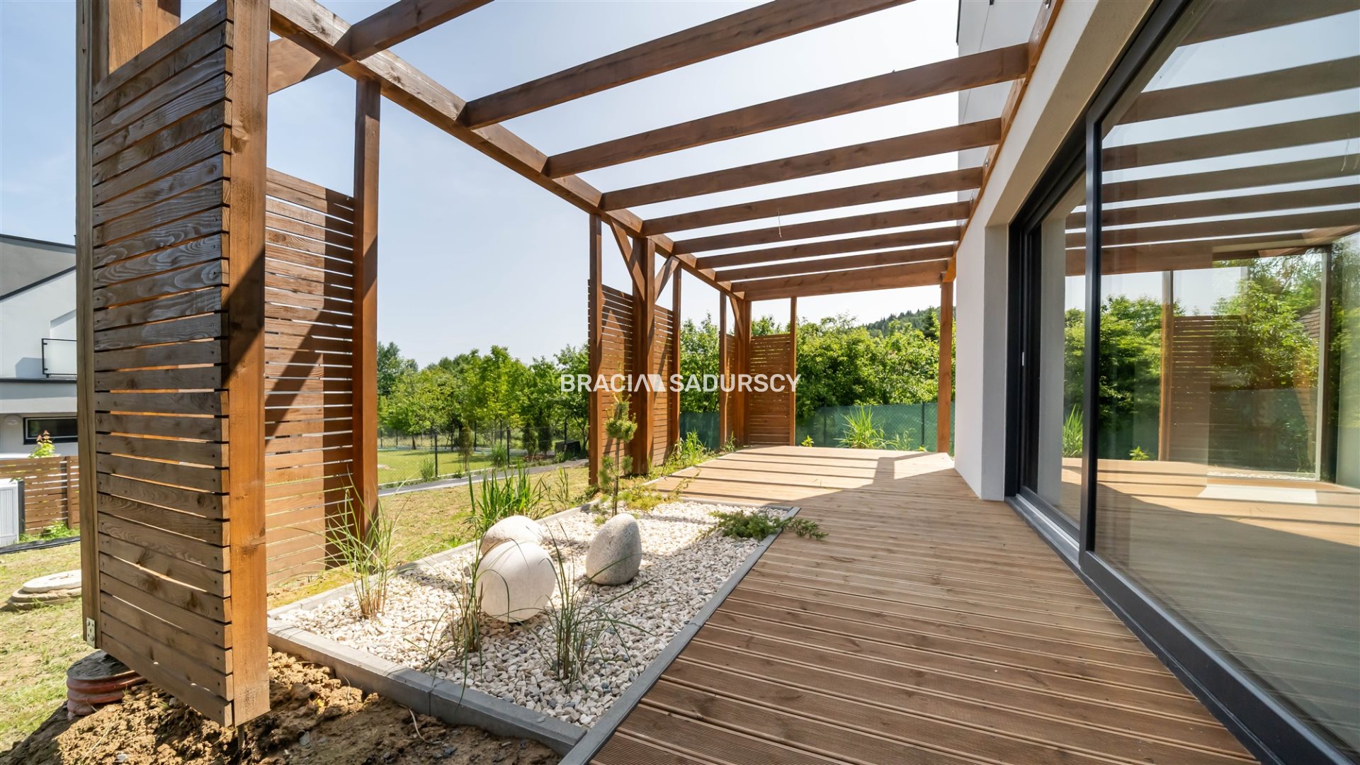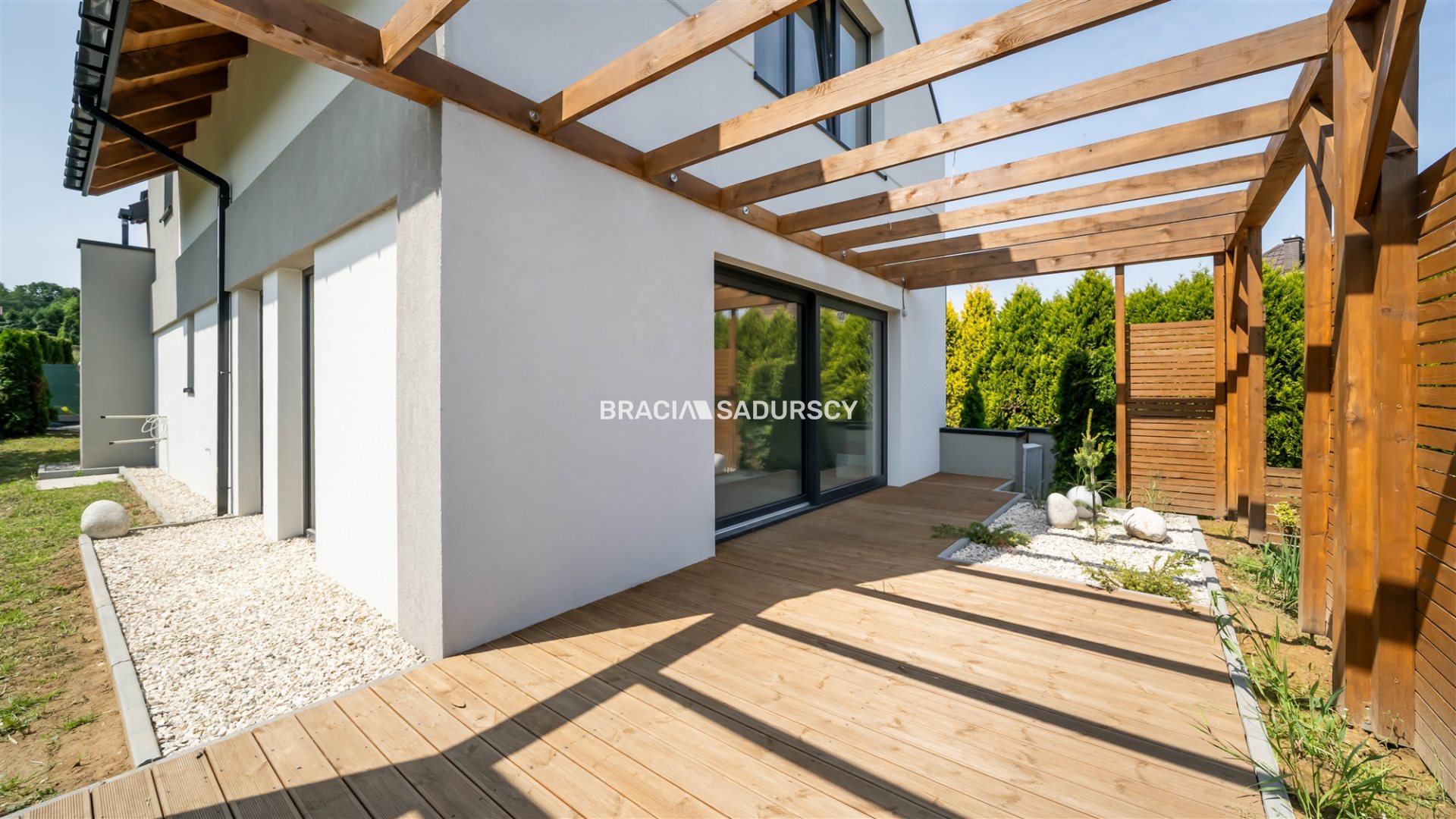 Wnętrze budynku to jasne i przestronne pomieszczenia z dużymi przeszkleniami, które zapewniają naturalne doświetlenie. Z salonu wyjście prowadzi na taras z pergolą - idealne miejsce do relaksu. Do dyspozycji mieszkańców jest również wiata na dwa samochody oraz wydzielona część ogrodu, ogrodzona estetycznym, drewnianym płotem i siatką.