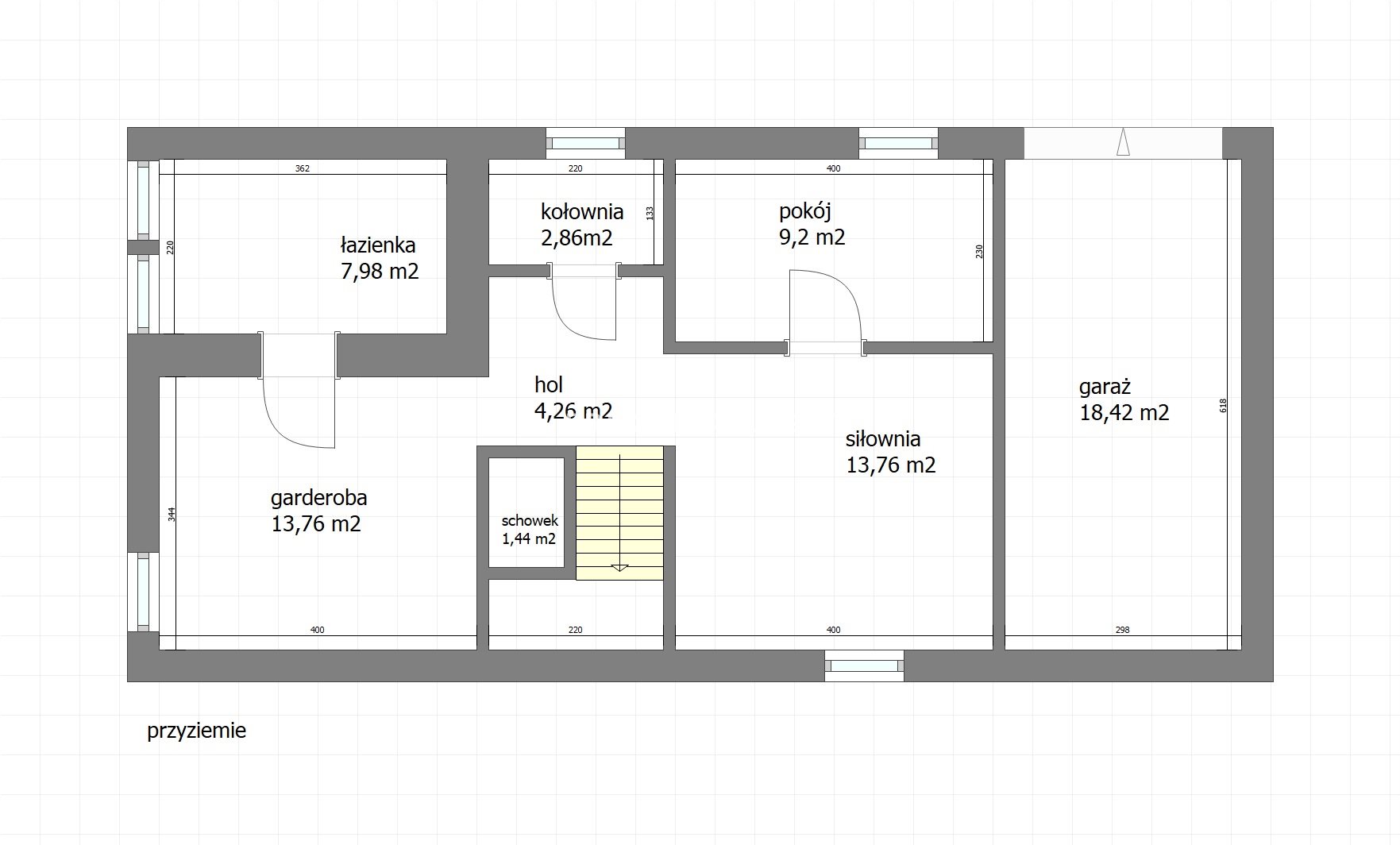- z kondygnacji przyziemnej o pow.: 71,66 m 2 , zawierającej: garaż jednostanowiskowy o pow.: 18,42 m 2 , kotłownię (2,86 m 2 ), garderobę (13,76 m 2 ), łazienkę (7,96 m 2 ), pokój (siłownia) o pow.: 13,76 m 2 ; pokój (9,20 m 2 ), schowek (1,44 m 2 ) oraz Hol (4,26 m 2 ).