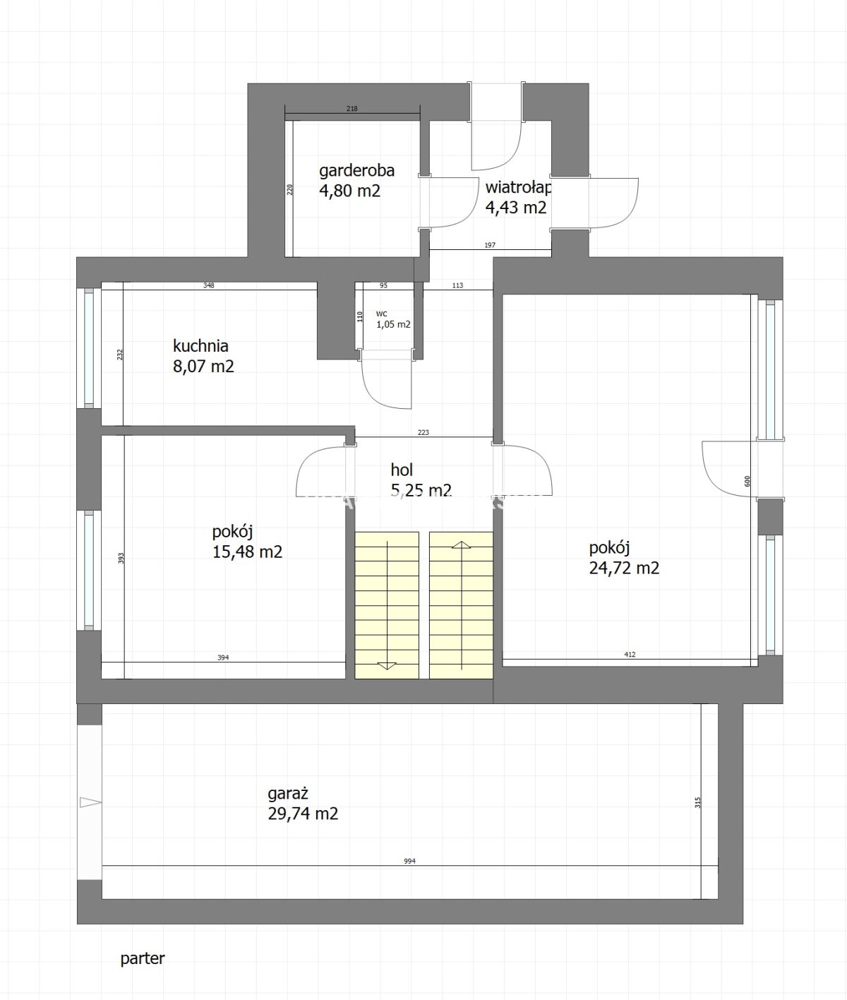 - parteru o pow: 93,45 m 2 , zawierającego: garaż o pow.: 29,74 m 2 , wiatrołap (4,34 m 2 ), garderobę (4,80 m 2 ), wc (1,05 m 2 ), kuchnię (8,07 m 2 ), pokój (15,48 m 2 ) oraz salon (24,72 m 2 ) z wyjściem na taras,