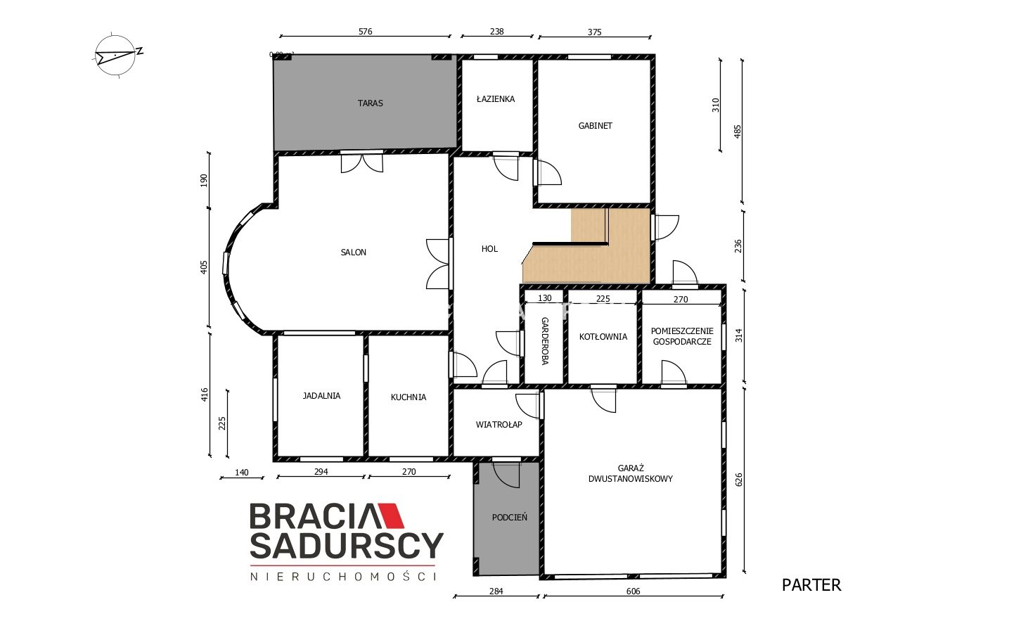 Na poziomie parteru znajduje się przestronny salon ( 38,42 m 2 ), połączony z jadalnią o pow.: 12,32 m 2 , osobna duża kuchnia o pow. 11,23 m 2 , pokój o pow. 18,18 m 2 , łazienka ( 7 , 38 m 2 ), łazienka o pow. 5,20 m 2 , garderoba ( 4,08 m 2 ), hall ( 24,09 m 2 ), wiatrołap ( 5,00 m 2 ), schowek ( 2,88 m 2 ), oraz w części gospodarczej, garaż o pow.: 36,10 m 2 , kotłownia ( 7,07 m 2 ), pomieszczenie gospodarcze ( 7,66 m2 ) z drugim wyjściem do ogrodu.