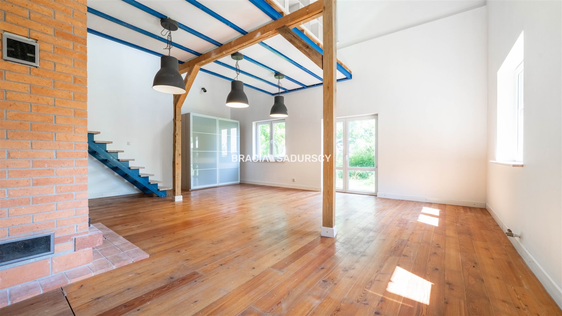 Wnętrza łączą styl loftowy z elementami tradycji - drewniana podłoga z modrzewia, ceglane akcenty przy kominku i przemyślany układ pomieszczeń dają wyjątkowy efekt przytulności i przestrzeni.