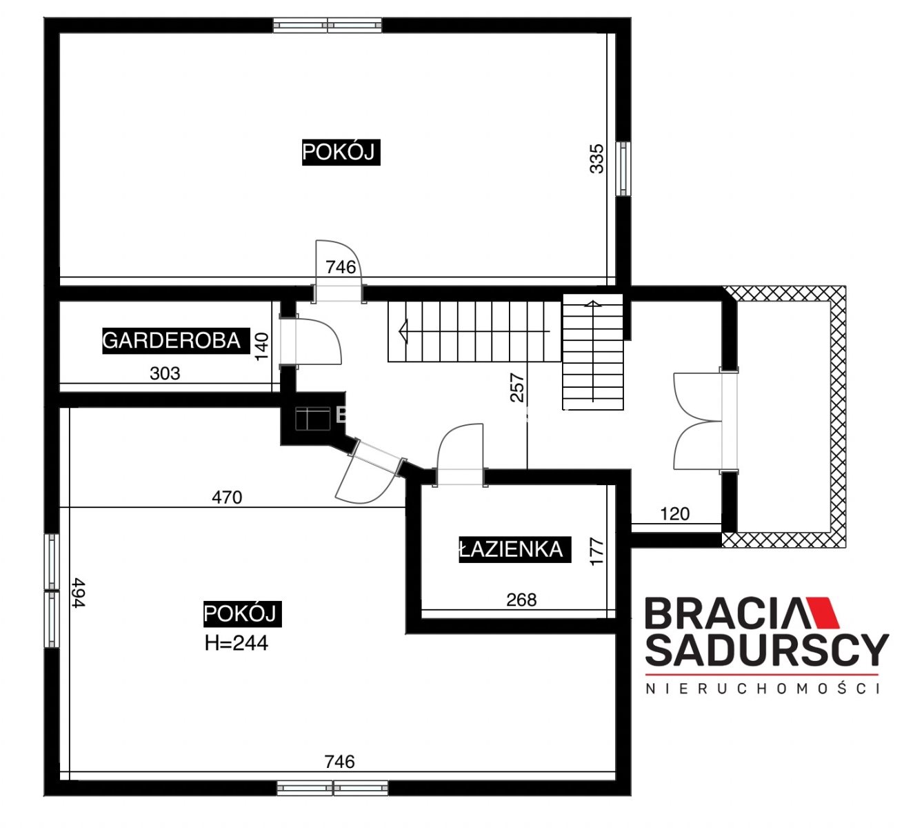 Piętro domu składa się dwóch pokoi, każdy ok. 20 m2, garderoby 3 m2, łazienki ok. 3 m2 oraz przedpokoju z wyjściem na balkon.