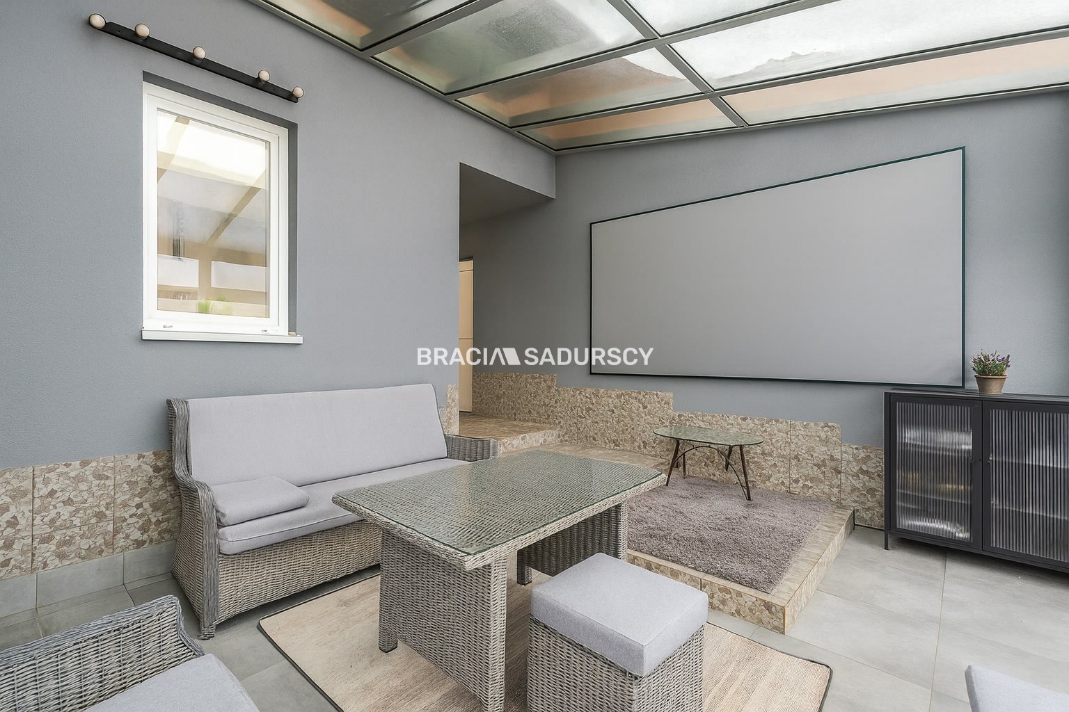 - od strony ogrodu przeszklona oranżeria (ogród zimowy) niezależne ogrzewanie kominkowe możliwość pozostawienia projektora kina domowego (do uzgodnienia)