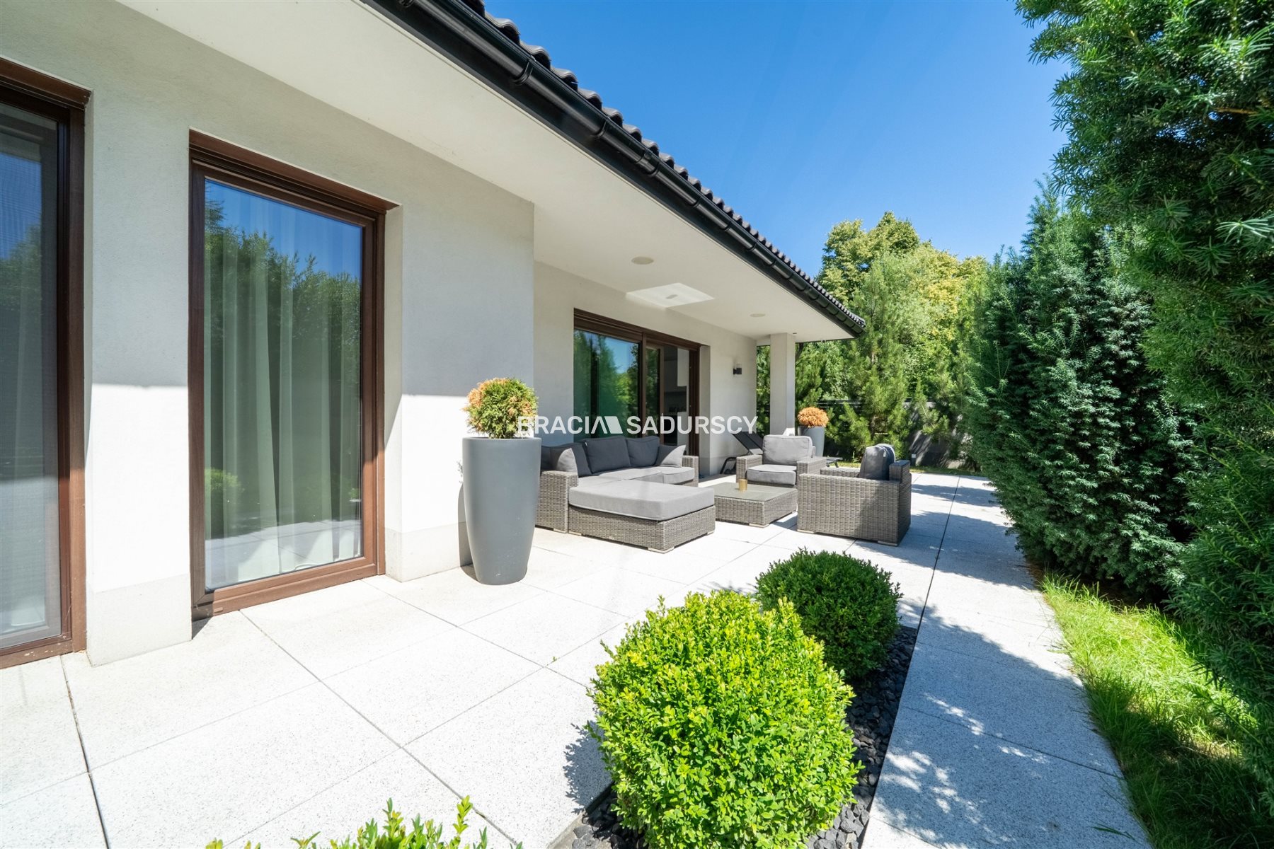 Działka zagospodarowana, kameralna, ogrodzona. Brama wjazdowa jak i garażowa otwierana pilotem, podjazd wybrukowany. Dom otoczony pasmem zieleni.