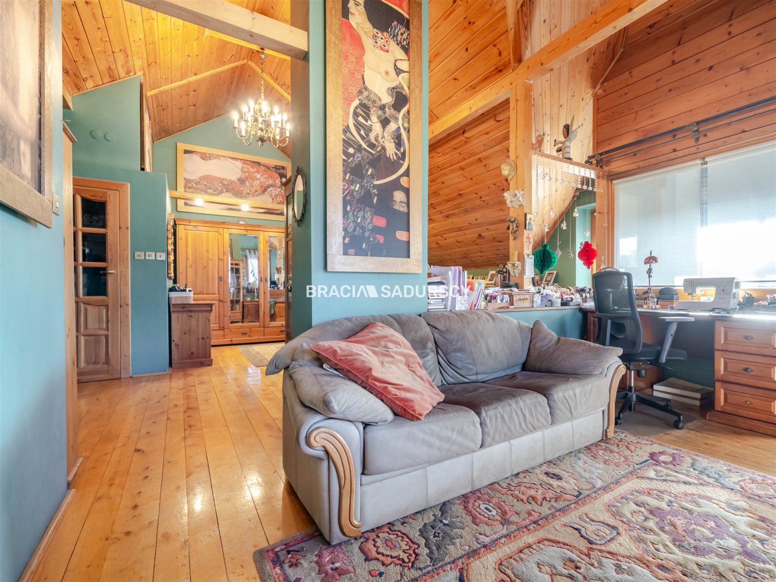 Miłośnikom otwartych przestrzeni powinno spodobać się poddasze z pięknie wykończonym w drewnie sufitem, podobnie podłogę cechuje naturalny materiał jakim jest drewno.