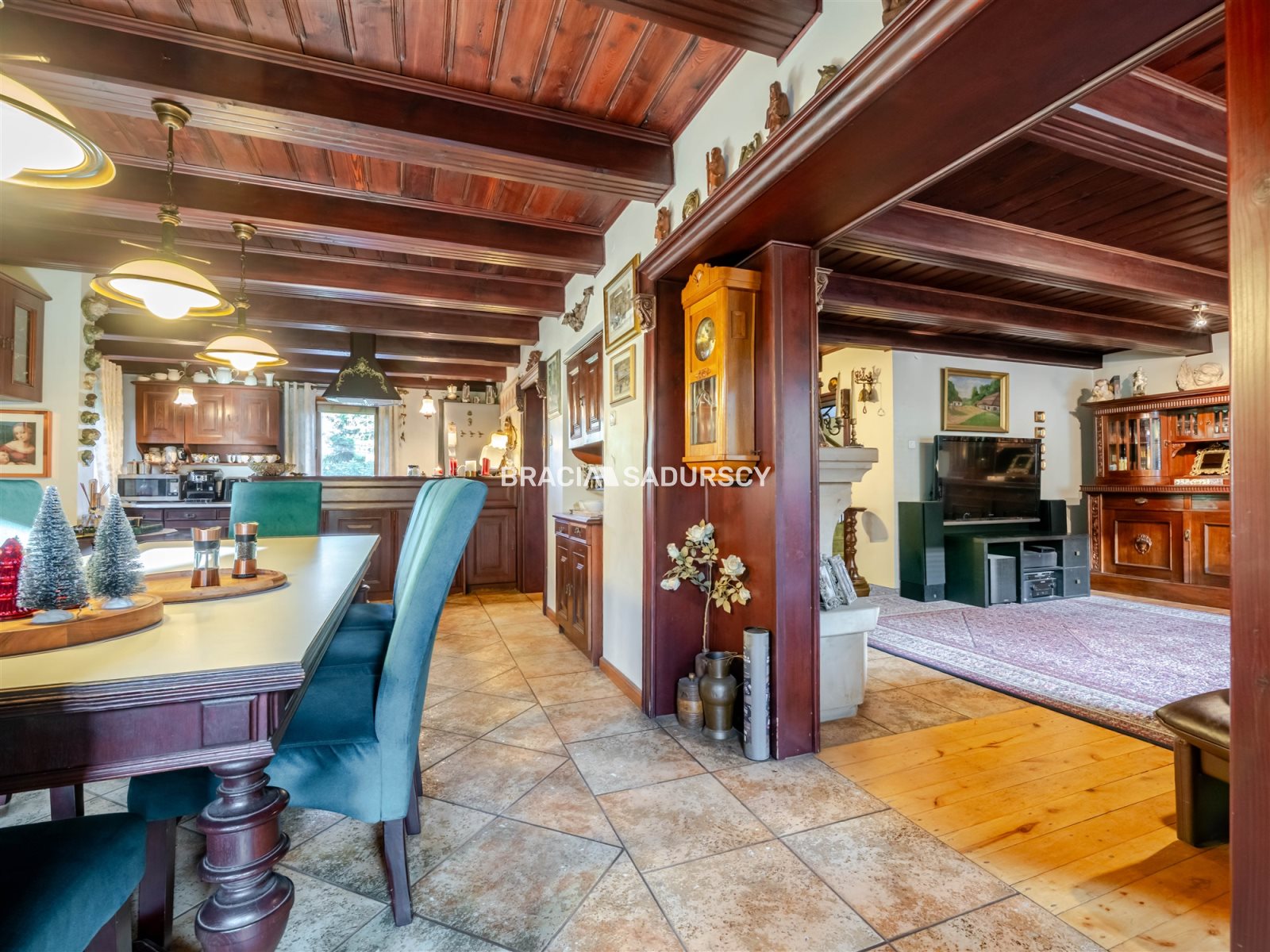 W salonie, jadalni i kuchni na uwagę zasługuje modrzewiowe zwieńczenie sufitu , podkreślające wyjątkowy charakter pomieszczeń.