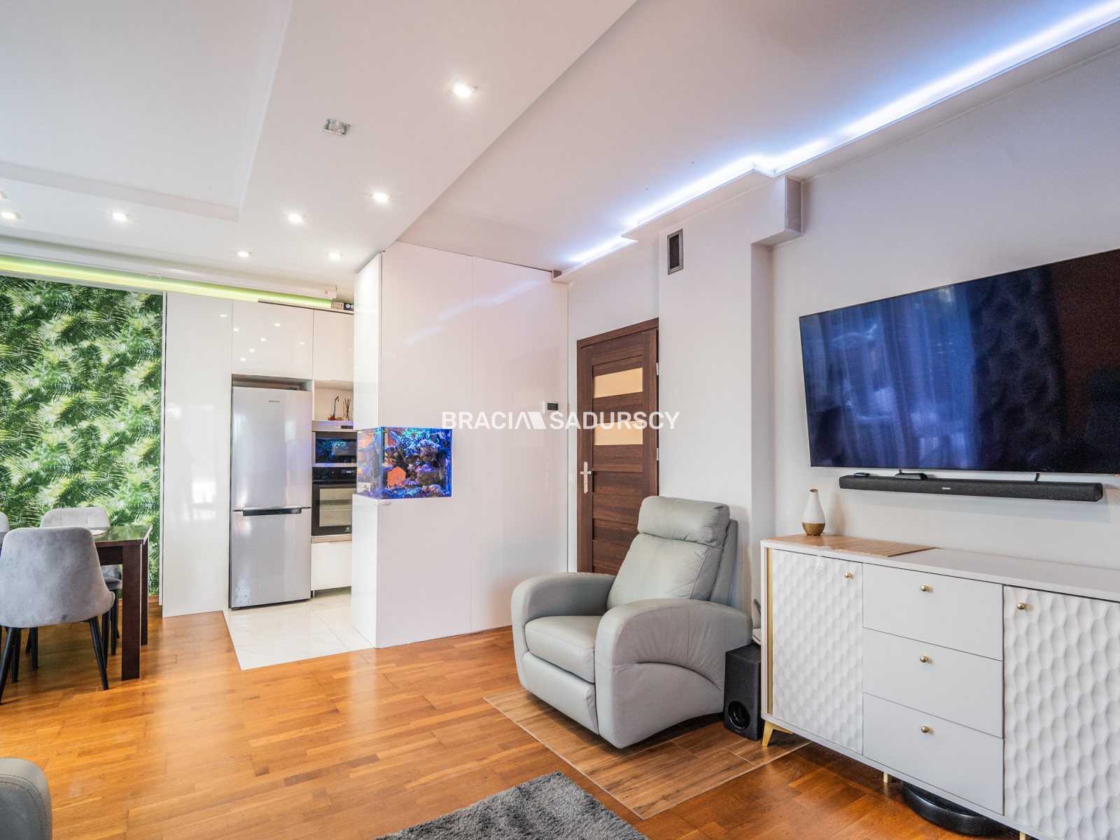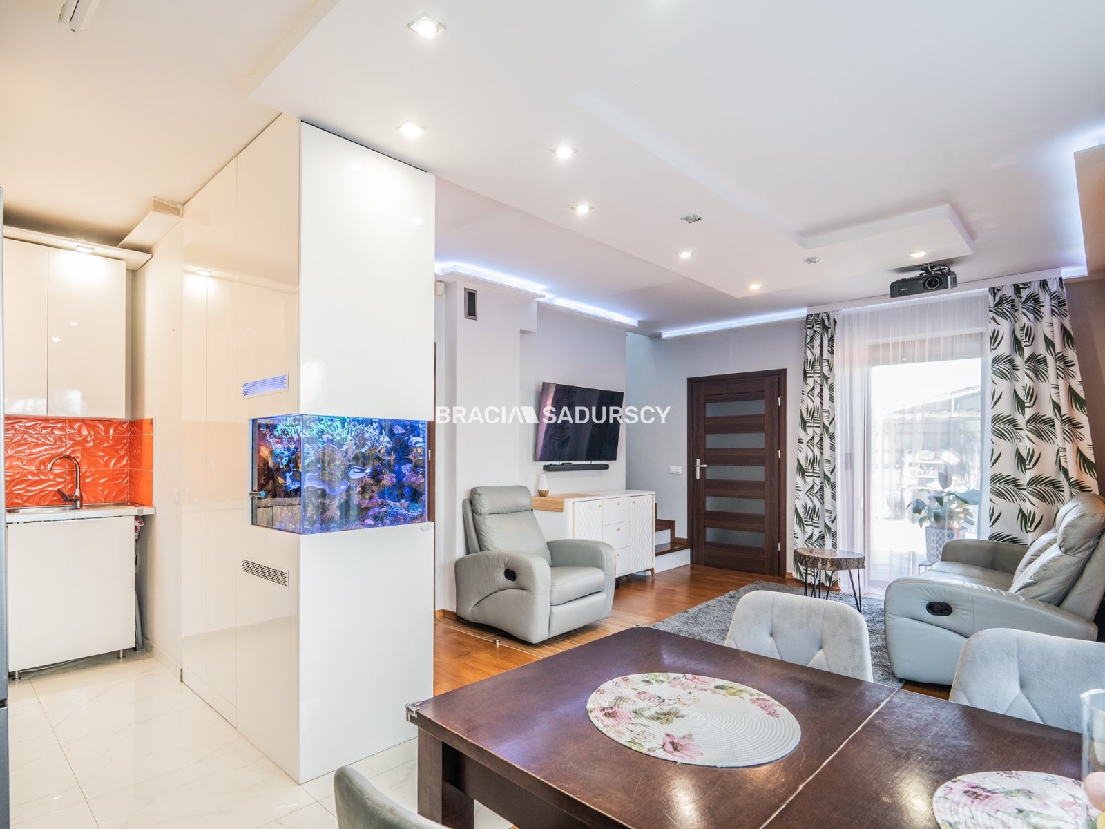 przestronny i jasny salon z aneksem kuchennym 29m2 oraz wyjściem na taras,