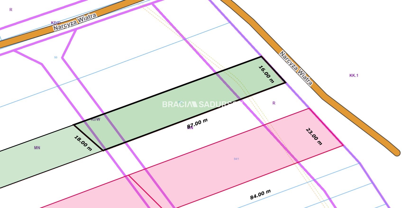 Działka ma powierzchnię wynoszącą 1318 m2, jest objęta ustaleniami miejscowego planu zagospodarowania przestrzennego i składa się z części terenu pod zabudowę mieszkaniową jednorodzinną MN ( 857 m2 ), terenu komunikacji KD (145 m2) i terenu rolnego R (316 m2).