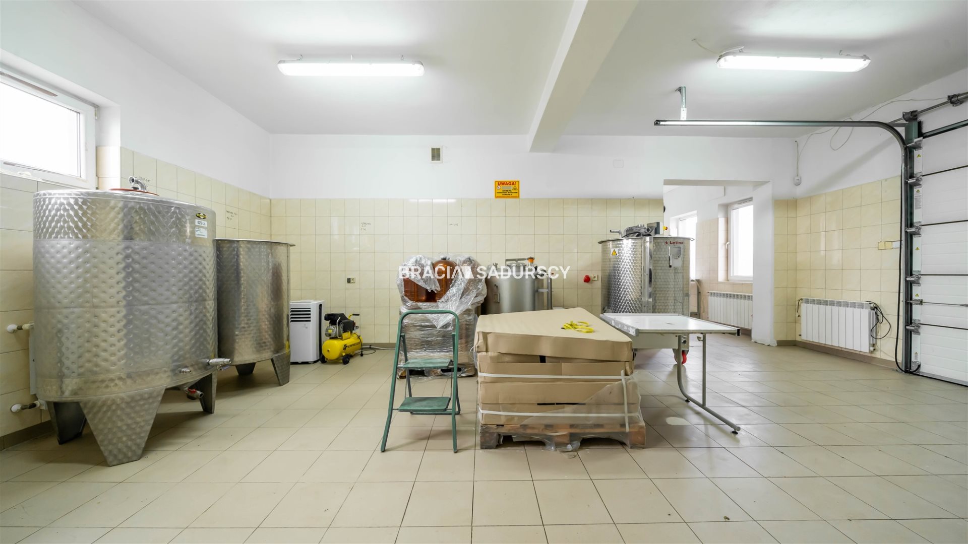 - na parterze - wysokim na ponad 3 metry, są dwa pomieszczenia do produkcji - 37m2 i 35m2, do tego dwa pomieszczenia magazynowe i schowek, a także kotłownia - z piecem dwufunkcyjnym, zasobnikiem wody i centralką odsługującą fotowoltaikę.