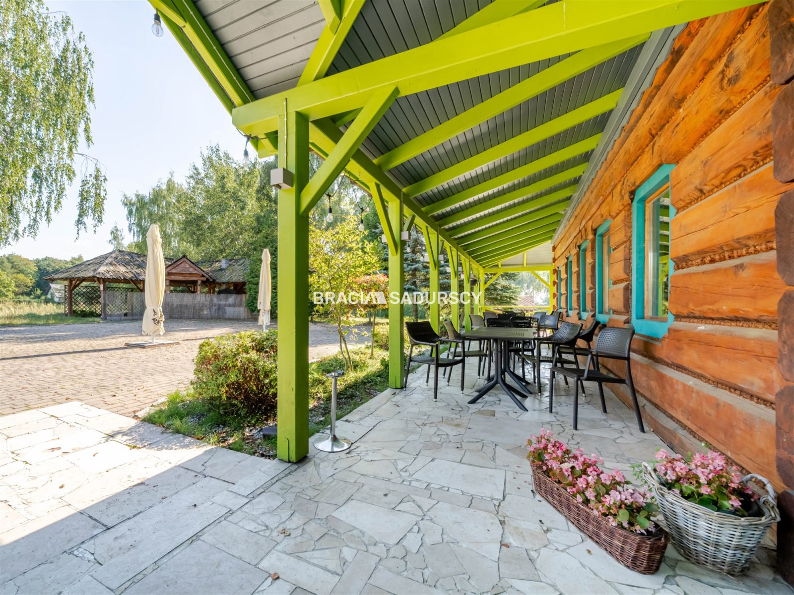 duży teren zielony z chatą grillową