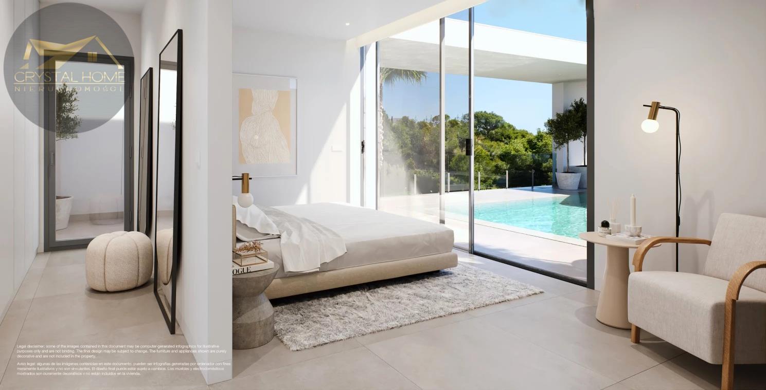 Główna sypialnia tej wspaniałej willi to prawdziwa oaza ciszy i spokoju, zaprojektowana tak, aby oferować najwyższy poziom luksusu. Masz stąd wspaniałe widoki na basen, tworząc płynne połączenie między życiem wewnątrz i na zewnątrz.