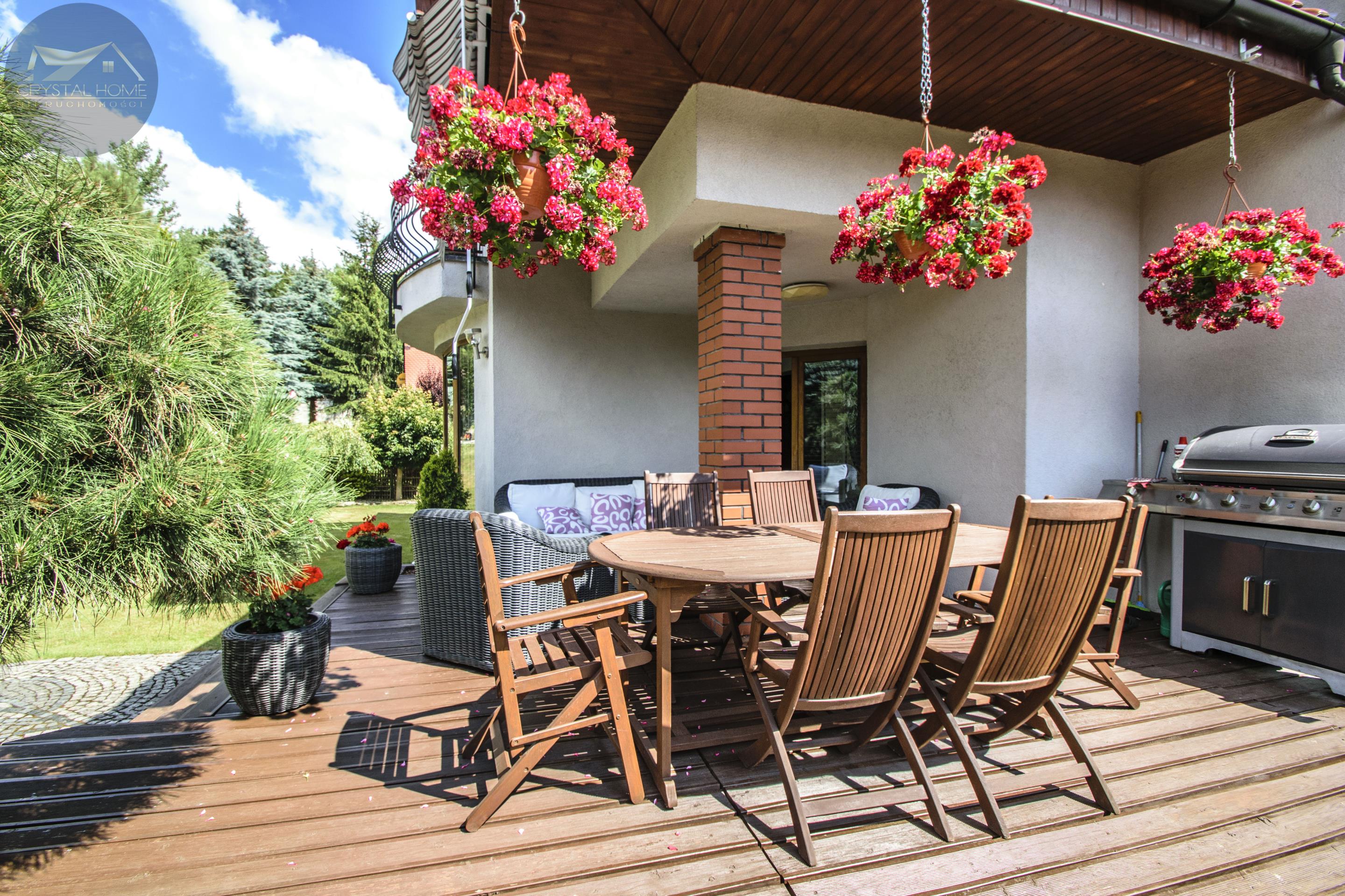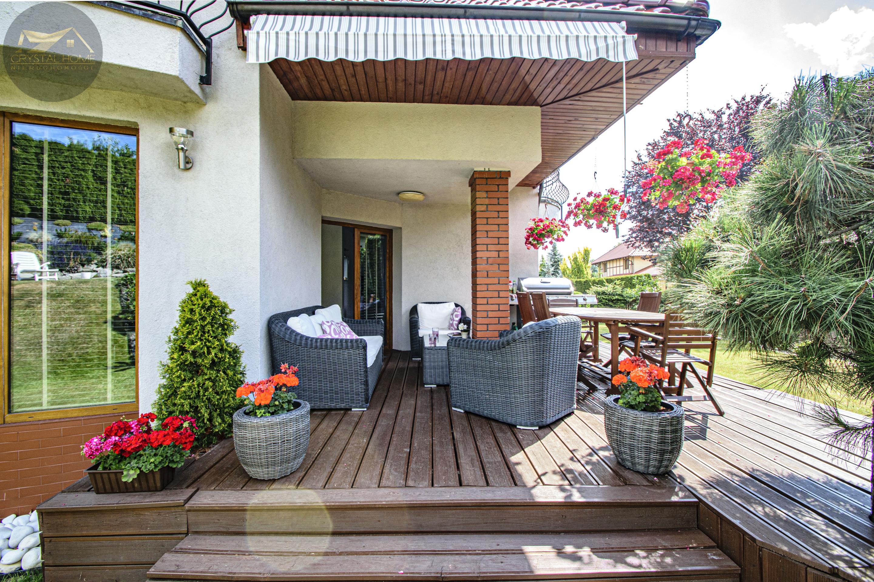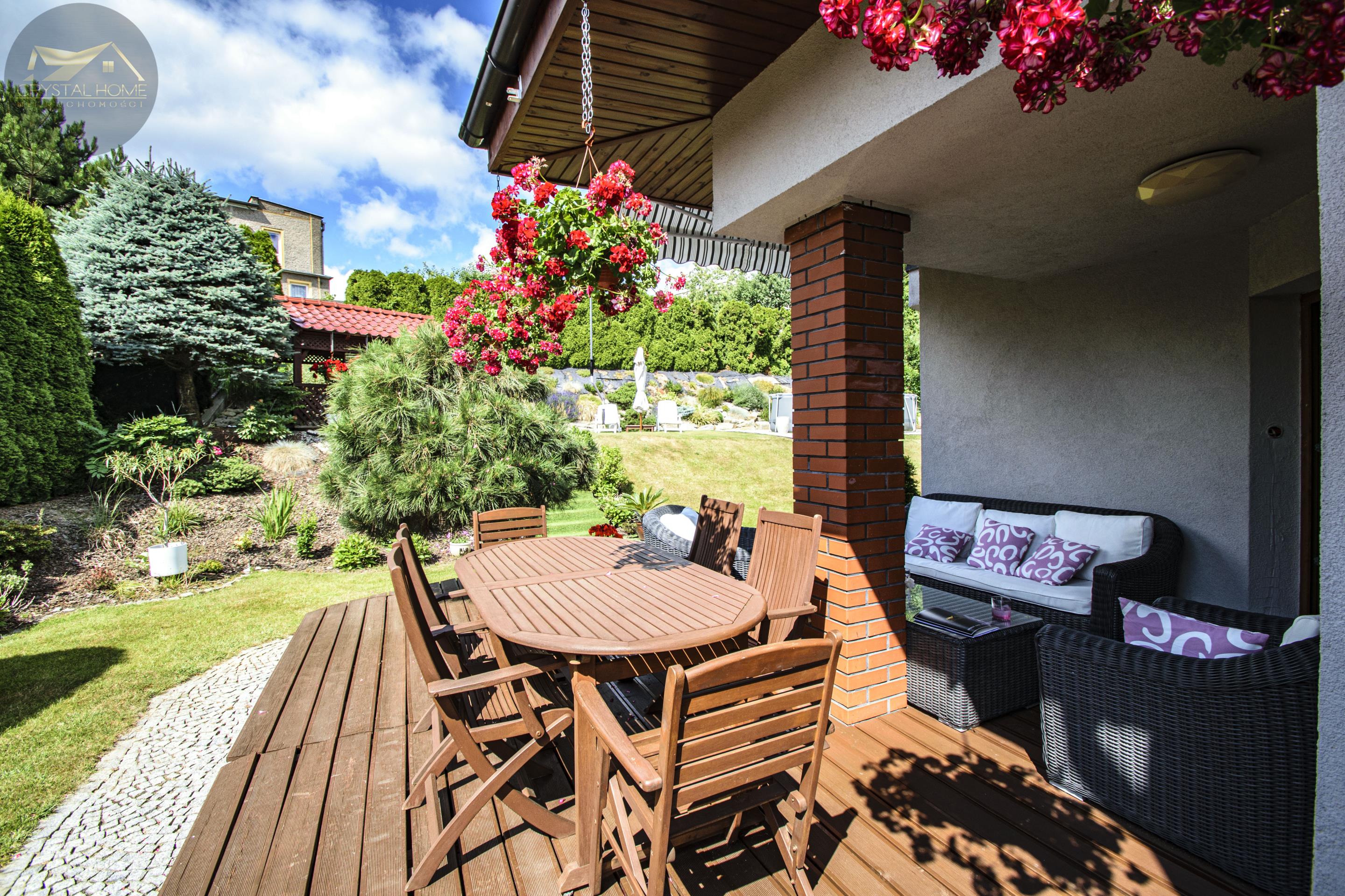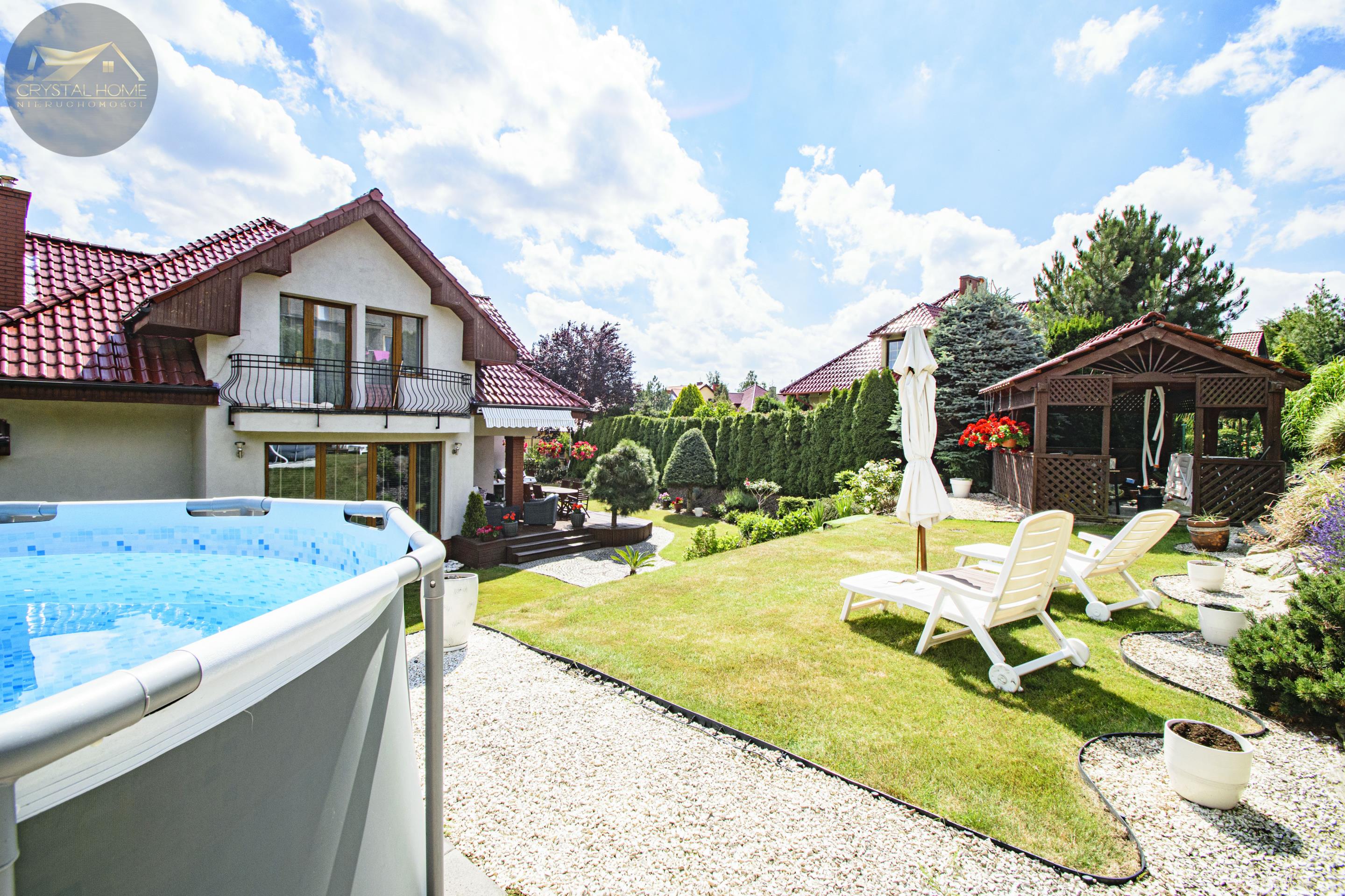 Ogród został starannie zagospodarowany trawnikiem, kolorowymi kwiatami oraz altanką wykończoną dachówką ceramiczną.